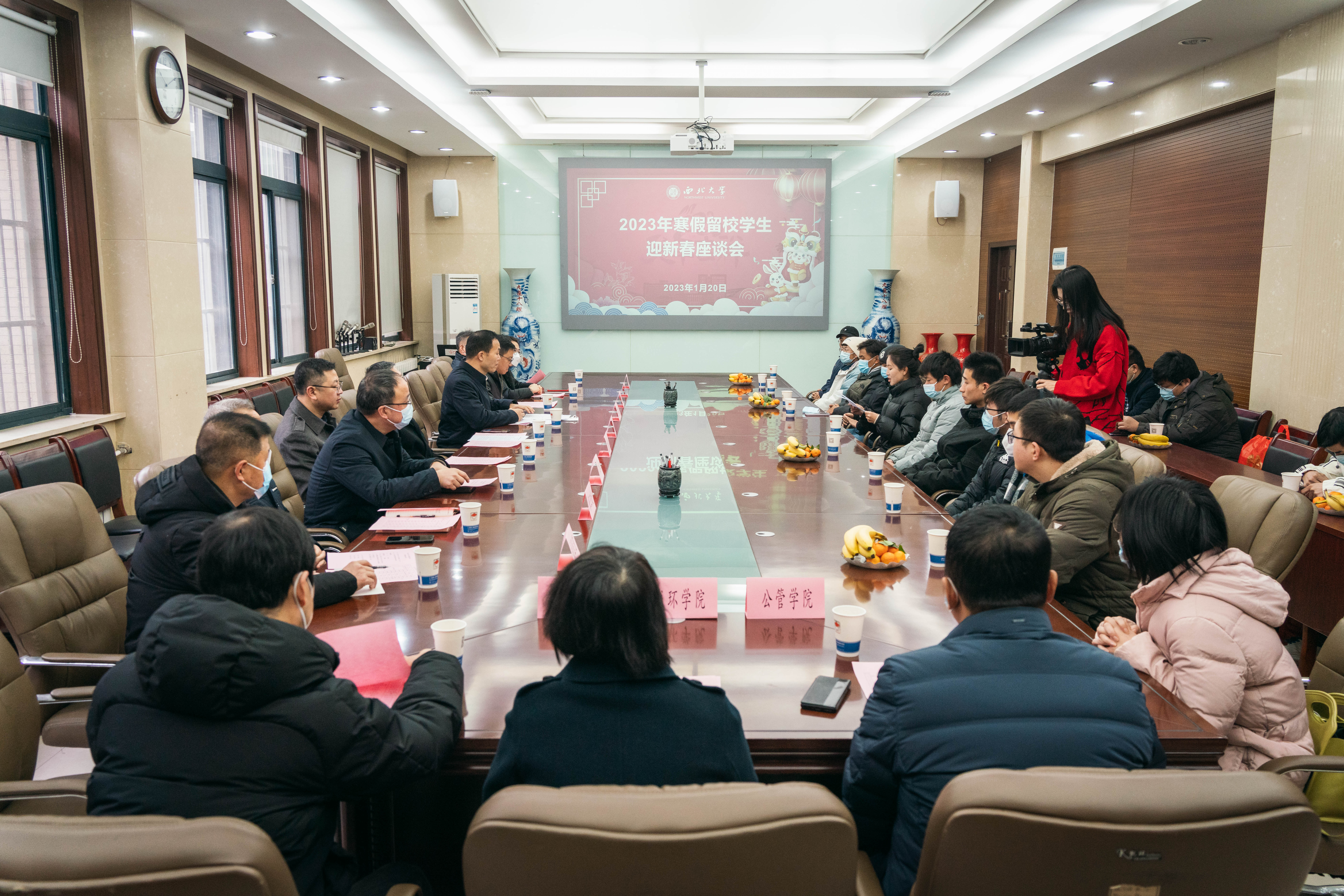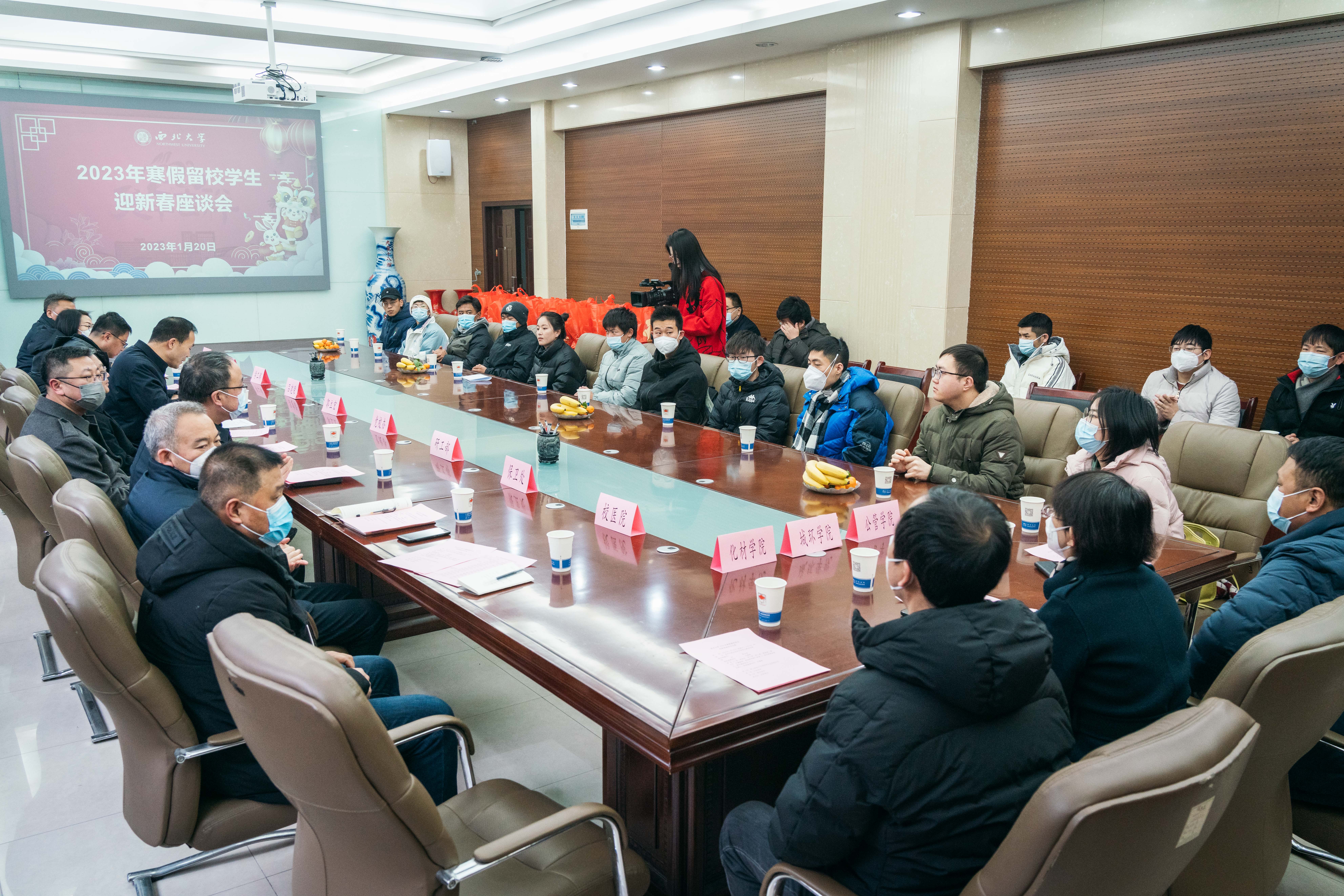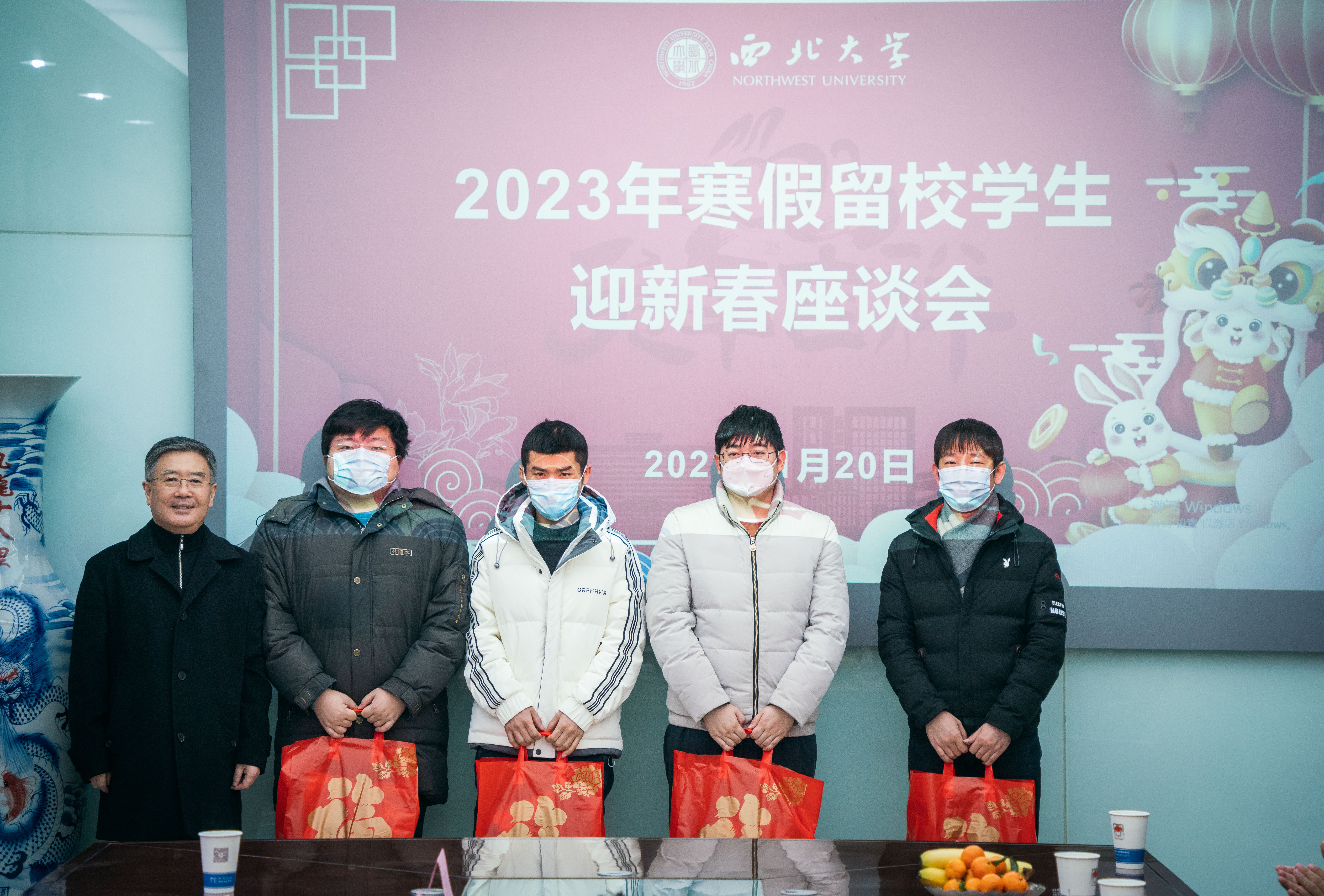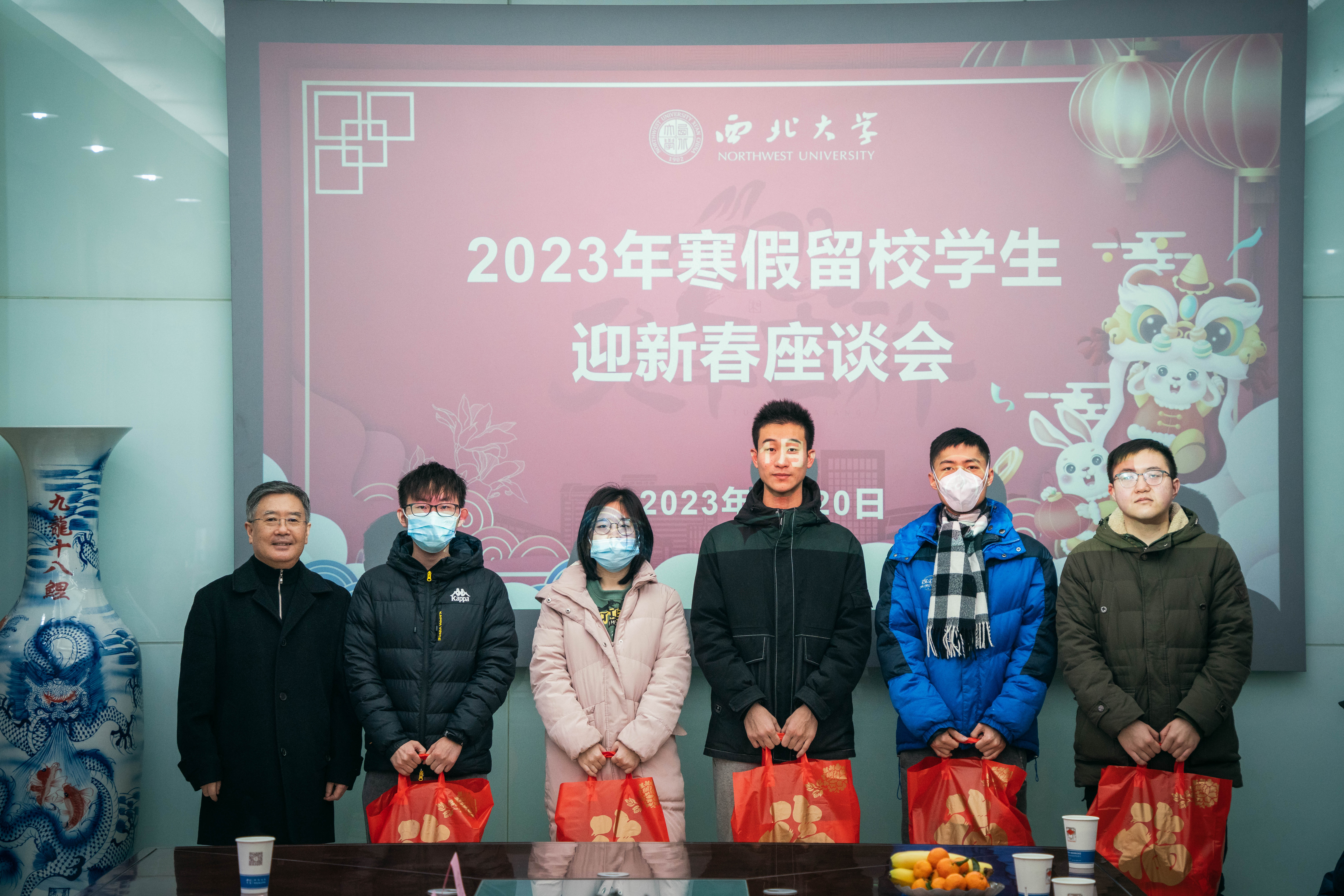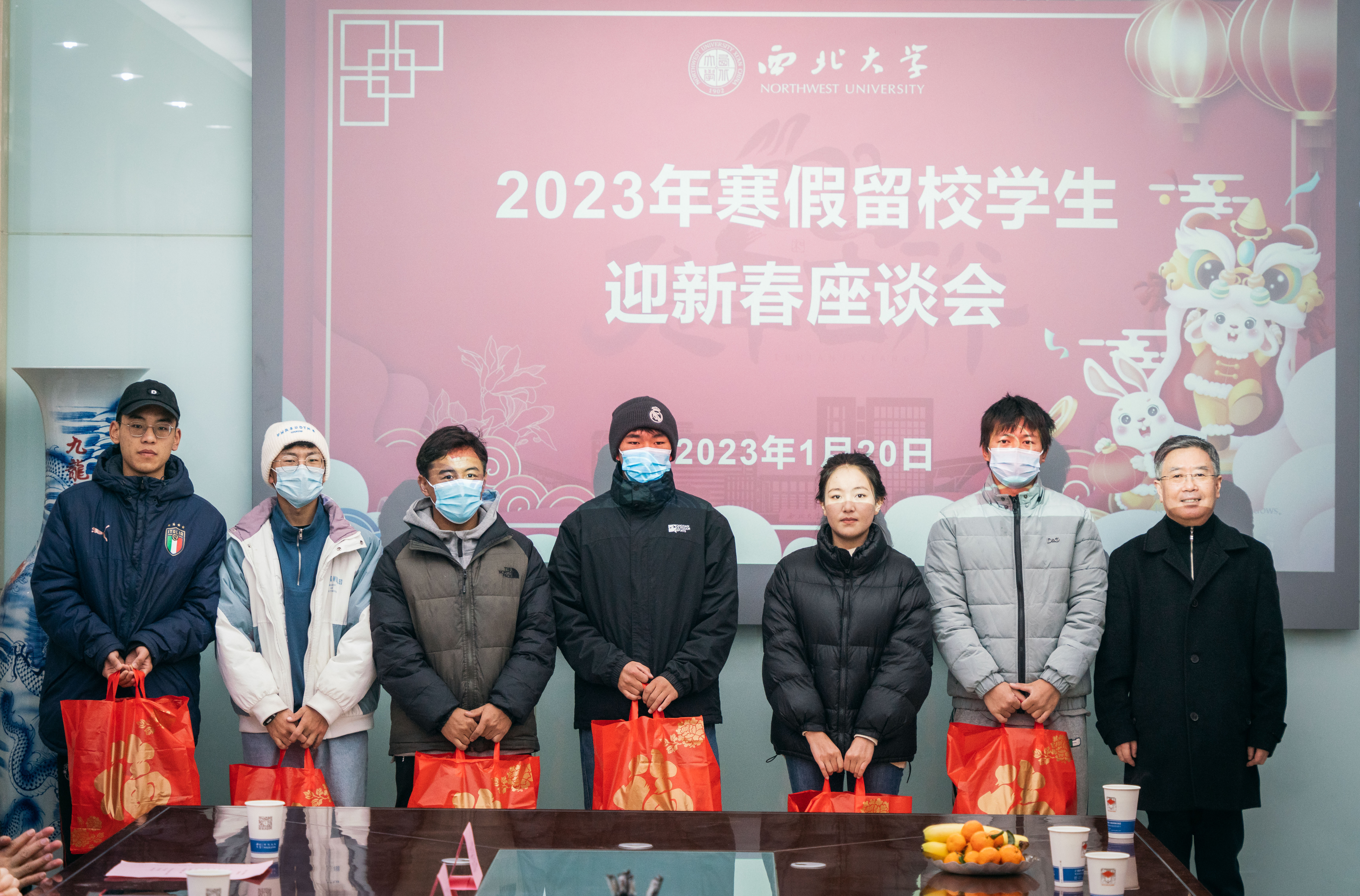 郭立宏为留校学生发放了新春慰问大礼包并合影留念。后勤集团、保卫处、校医院负责人对春节假期的服务保障工作作了说明。公共管理学院本科生哈吾沙合·阿以登和化学与材料科学学院研究生钱军怡代表留校学生作了发言,他们汇报了过去一年的学习生活情况,并对留校期间和新学期的学习生活进行了规划。同学们表示感谢学校对留校学生的关心与关爱,寒假留校期间,一定会协调好学习、科研、生活,过一个充实和让学校和家长放心的新年。
