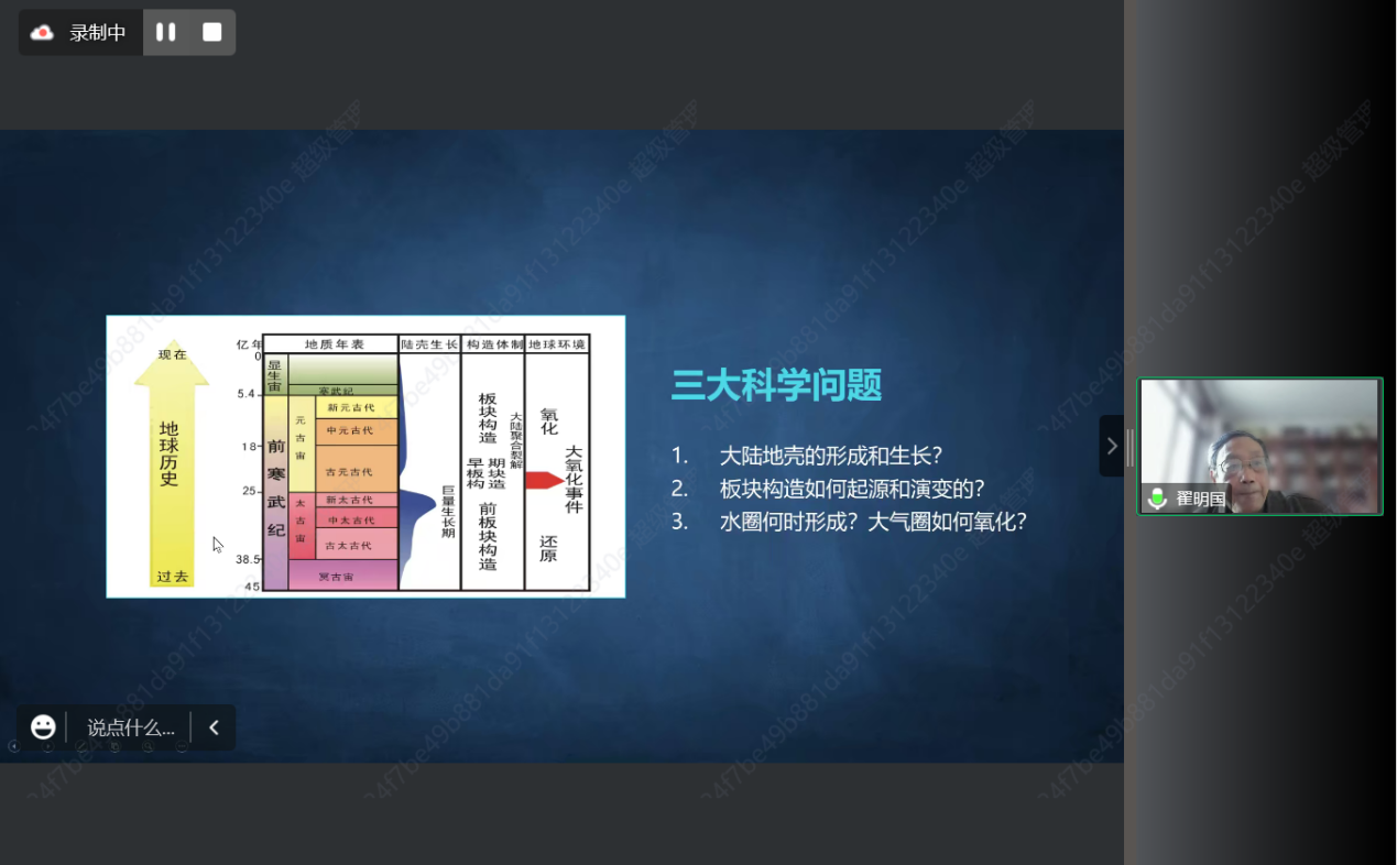 12月15日,中国科学院院士翟明国应邀做客beat365官网“杨钟健学术讲座”,在线为师生作了题为“石破天惊说地球”的报告。校党委常委、副校长常江代表学校致欢迎辞,学校相关部门负责人和师生代表听取了报告,报告由地质学系负责人主持。