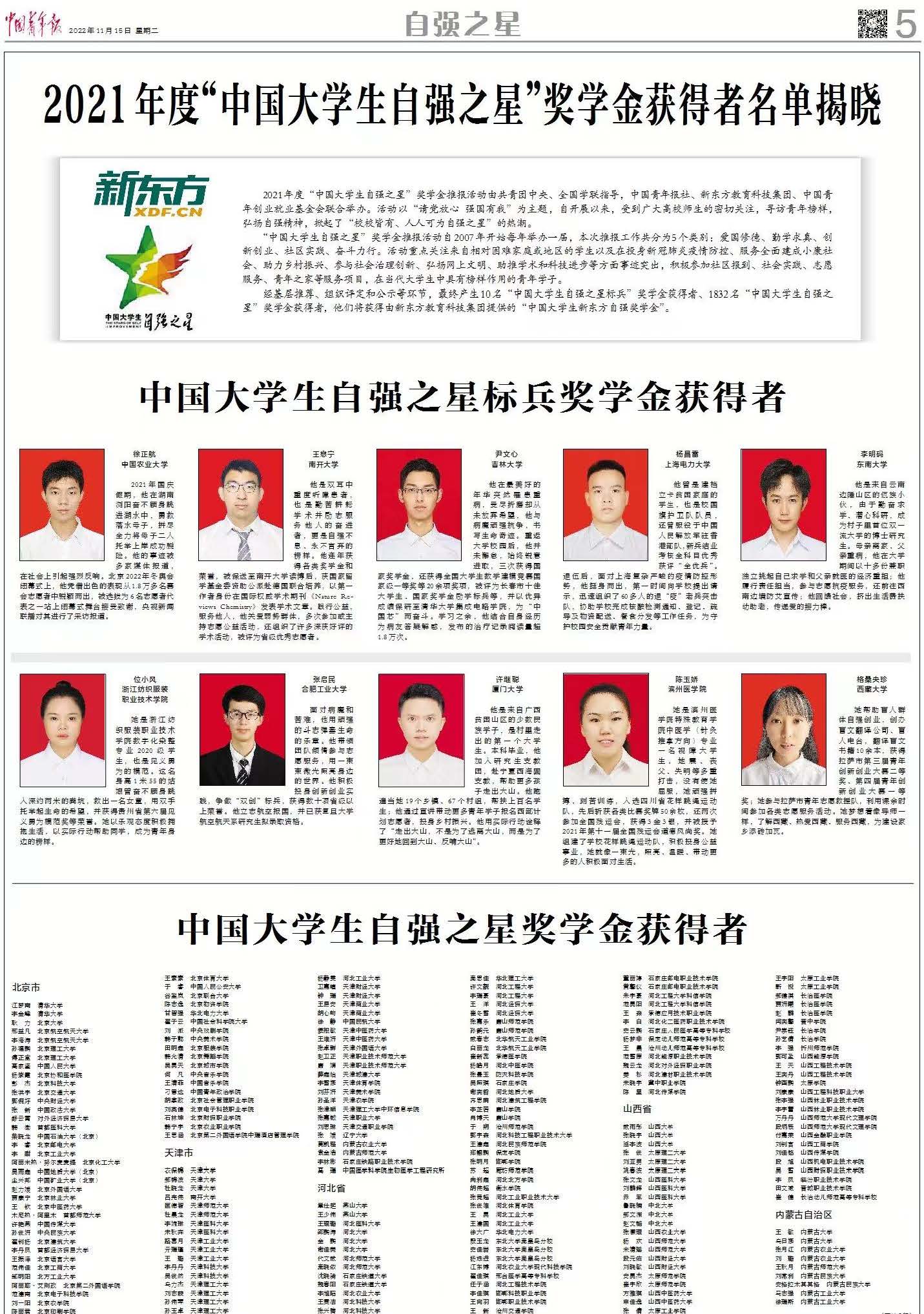 “中国大学生自强之星”奖学金推报活动由共青团中央、全国学联等联合指导开展,受到广大高校师生的密切关注,寻访青年榜样,弘扬自强精神,掀起了“校校皆有、人人可为自强之星”的热潮。本年度活动共分为爱国修德、勤学求真、创新创业、社区实践、奋斗力行5个类别。