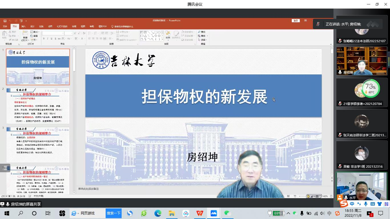 11月8日晚,吉林大学卓越教授房绍坤做客beat365官网“侯外庐学术讲座”第256讲,为师生作了题为“担保物权制度的新发展”的线上讲座。讲座由法学院王思锋教授主持,法学院师生220余人参加了此次讲座。
