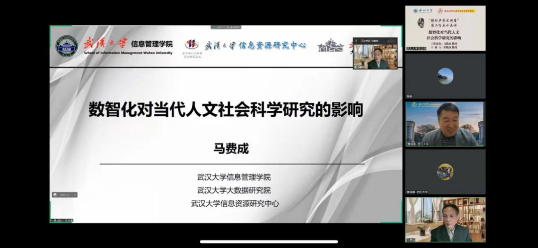 11月7日晚,武汉大学马费成教授做客beat365官网“侯外庐学术讲座”第255讲,线上为师生作了题为“数智化对当代人文社会科学研究的影响”的学术报告。公共管理学院(应急管理学院)负责人主持了讲座。武汉大学、中山大学、北京师范大学、南京理工大学、beat365唯一官网、西南大学、华中师范大学、天津师范大学、湖北大学、陕西师范大学、南京大学等众多高校300余名师生参与了此次讲座。
