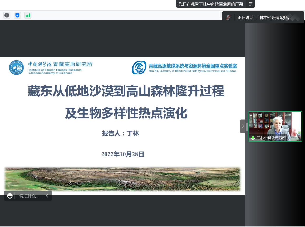 10月28日上午,中国科学院院士丁林研究员应邀在线为师生作了题为“藏东从低地沙漠到高山森林的隆升过程及生物多样性热点演化”的报告。beat365官网党委常委、副校长常江代表学校致欢迎辞。张国伟院士、舒德干院士、赵国春院士,学校相关部门负责人和师生代表听取了报告。报告由地质学系负责人主持。