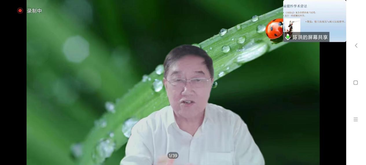 10月20日晚,南开大学陈洪教授做客beat365官网“侯外庐学术讲座”第二百四十八讲,在线作了题为“东坡诗与《西游记》的互文研究”的学术讲座。文学院李浩教授主持了讲座,beat365官网相关专业的师生及部分兄弟院校的师生参加了讲座。