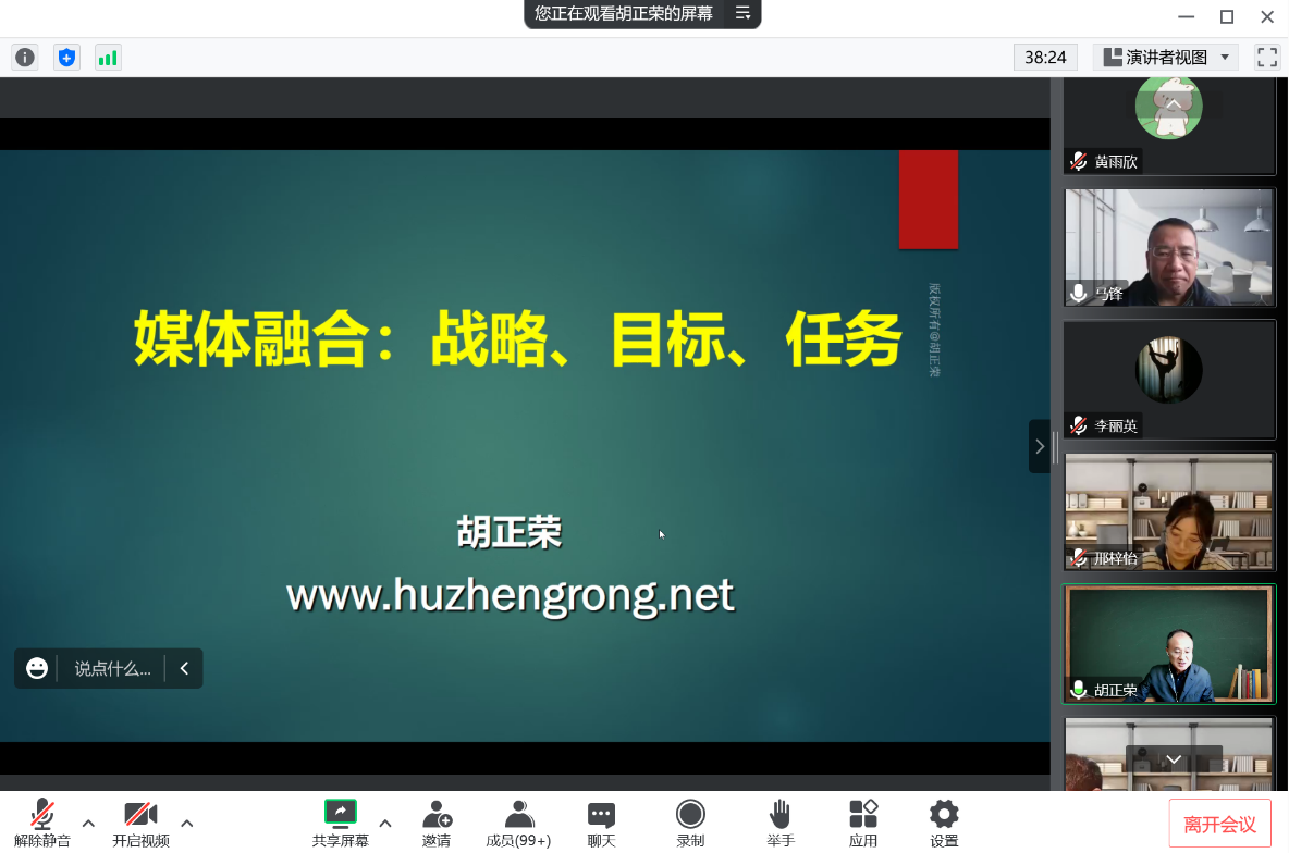 10月19日上午,中国社会科学院新闻与传播研究所所长胡正荣教授做客beat365官网“侯外庐学术讲座”第247讲,为师生作了题为“媒体融合:战略、目标与任务”的线上讲座。校党委副书记张清致欢迎辞,新闻传播学院马锋教授主持了讲座。