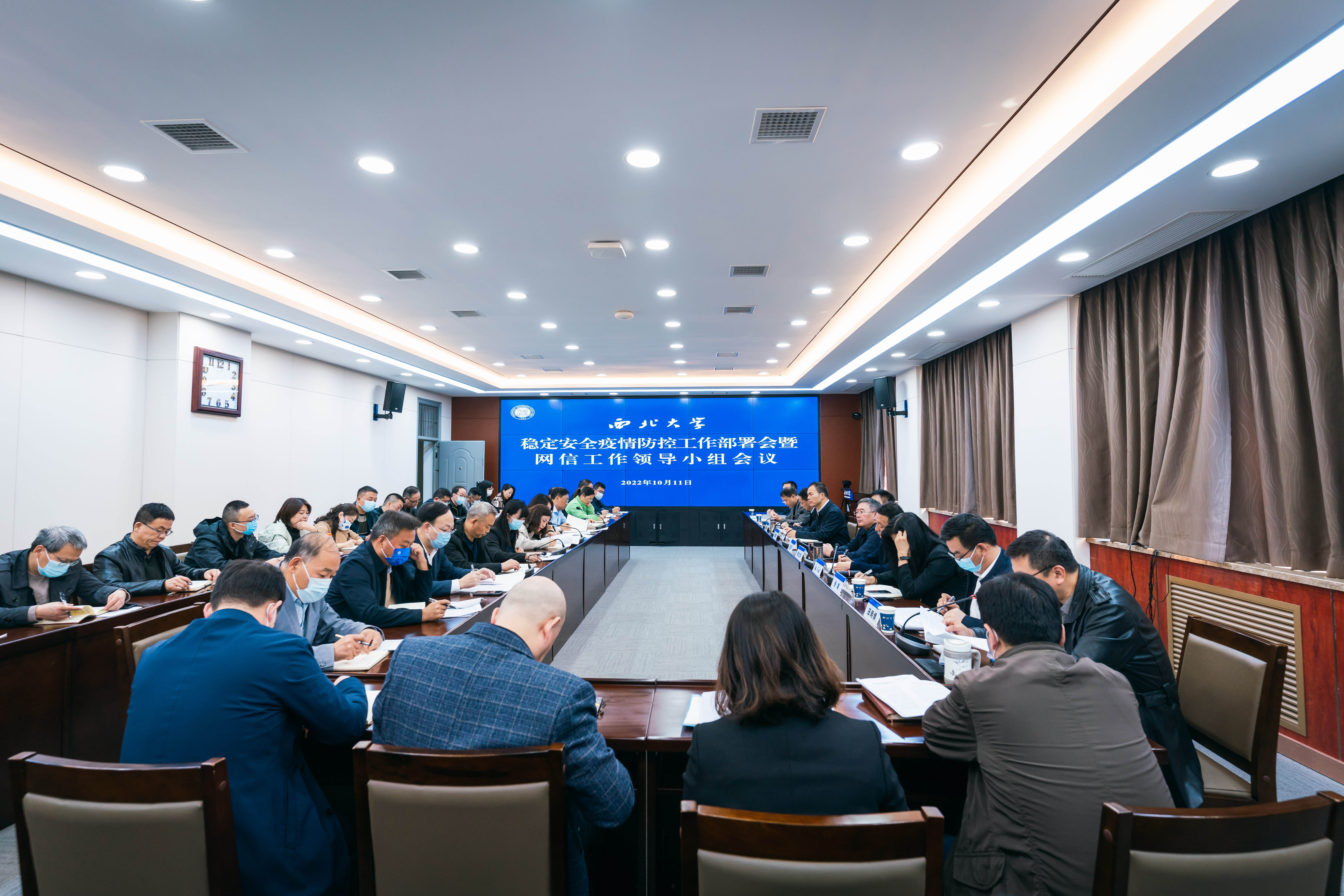 10月11日下午,为抓紧落实当天上午全省教育系统校园安全及疫情防控工作视频会议精神,学校在长安校区召开稳定安全、疫情防控工作会暨网信工作领导小组会议,进一步提高政治站位、统一思想,精准研判当前的各类风险隐患,对重点时期稳定安全、疫情防控和网络安全工作进行再强调、再部署、再安排。校党委书记王亚杰,校党委副书记、校长郭立宏,校党委副书记赵作纽、张清,校党委常委、副校长陈富林,校党委常委、宣传部长田明纲出席会议,相关职能部门、业务服务单位和各院(系)党委(直属党支部)主要负责同志参加会议。会议由校党委副书记吕建荣主持。