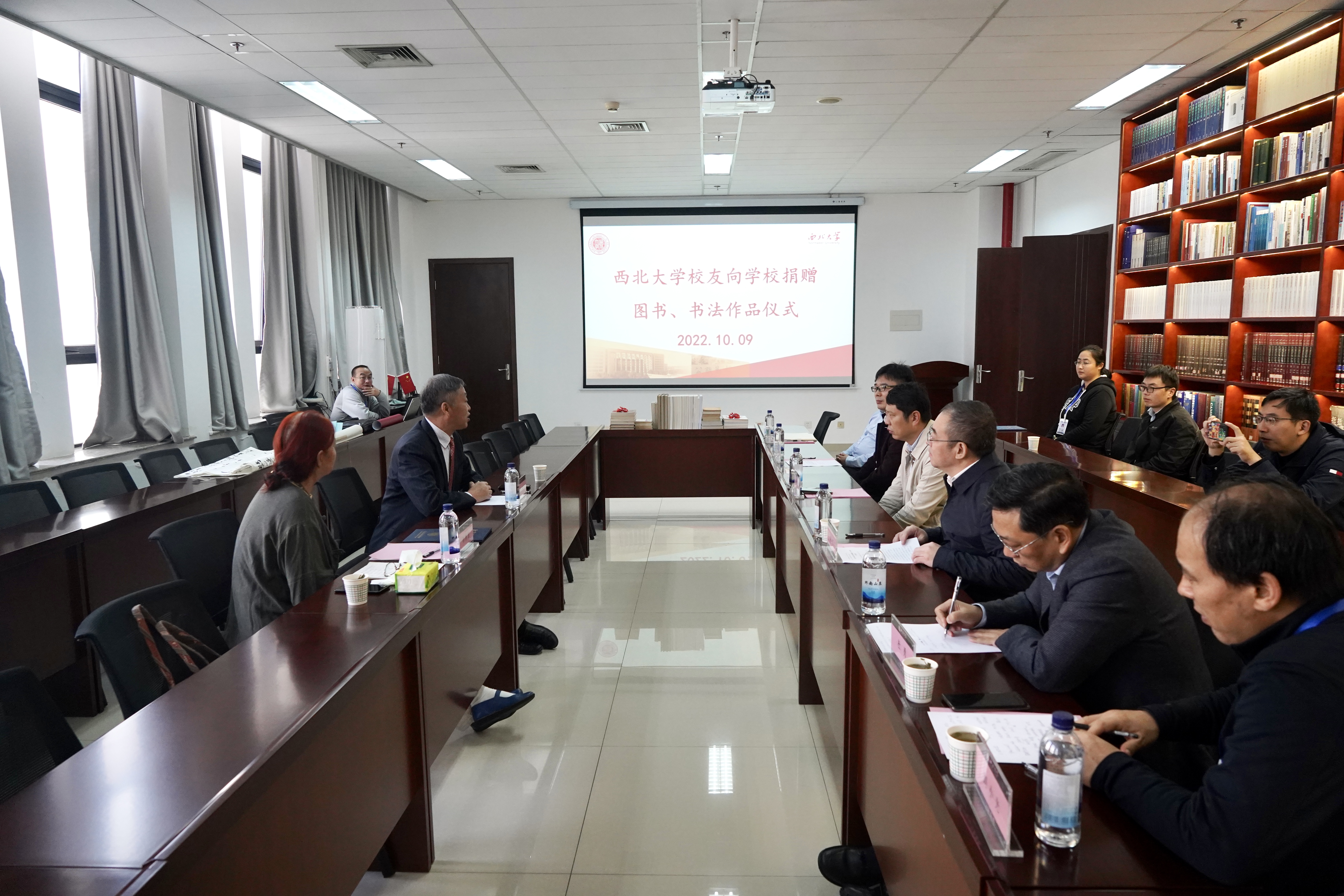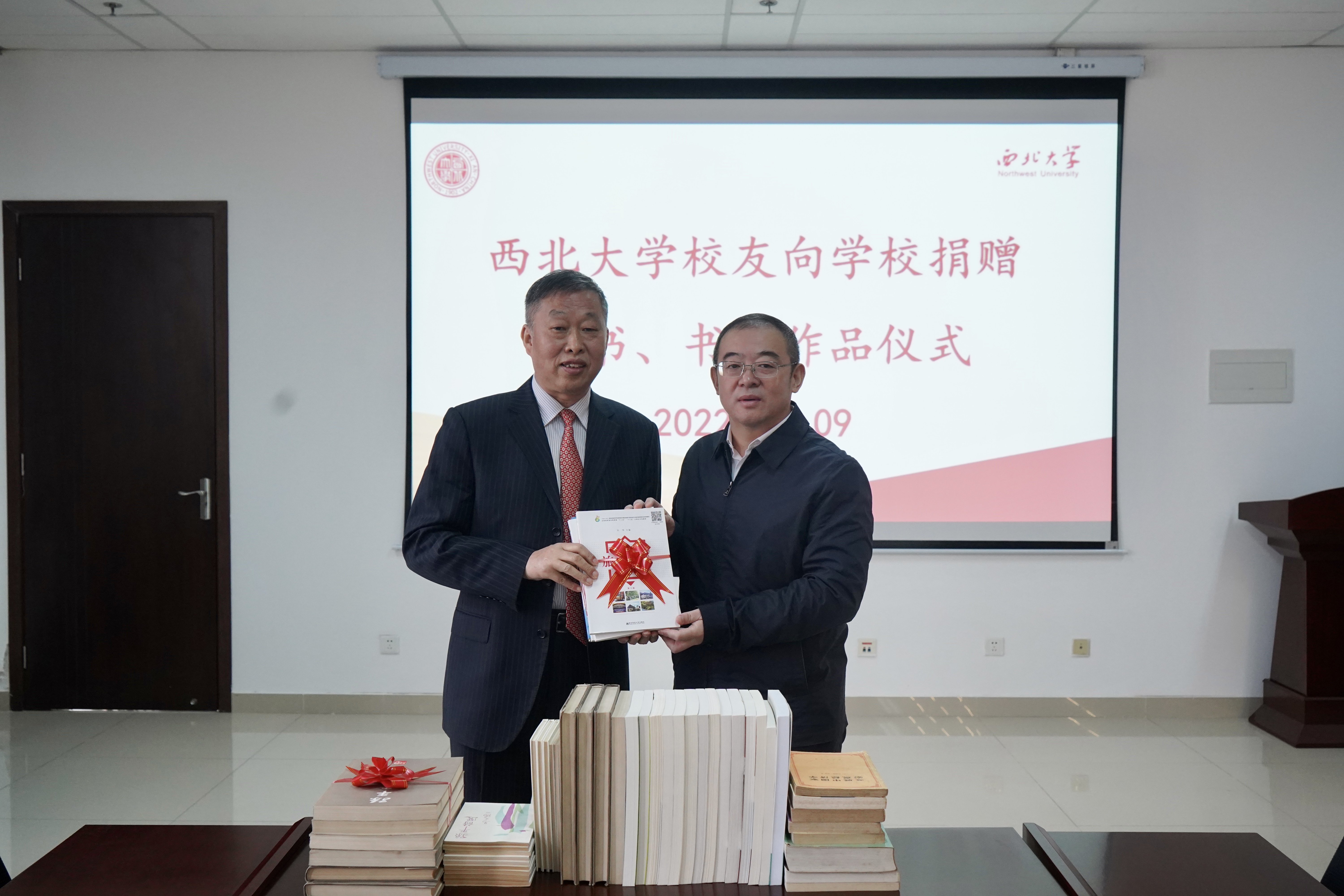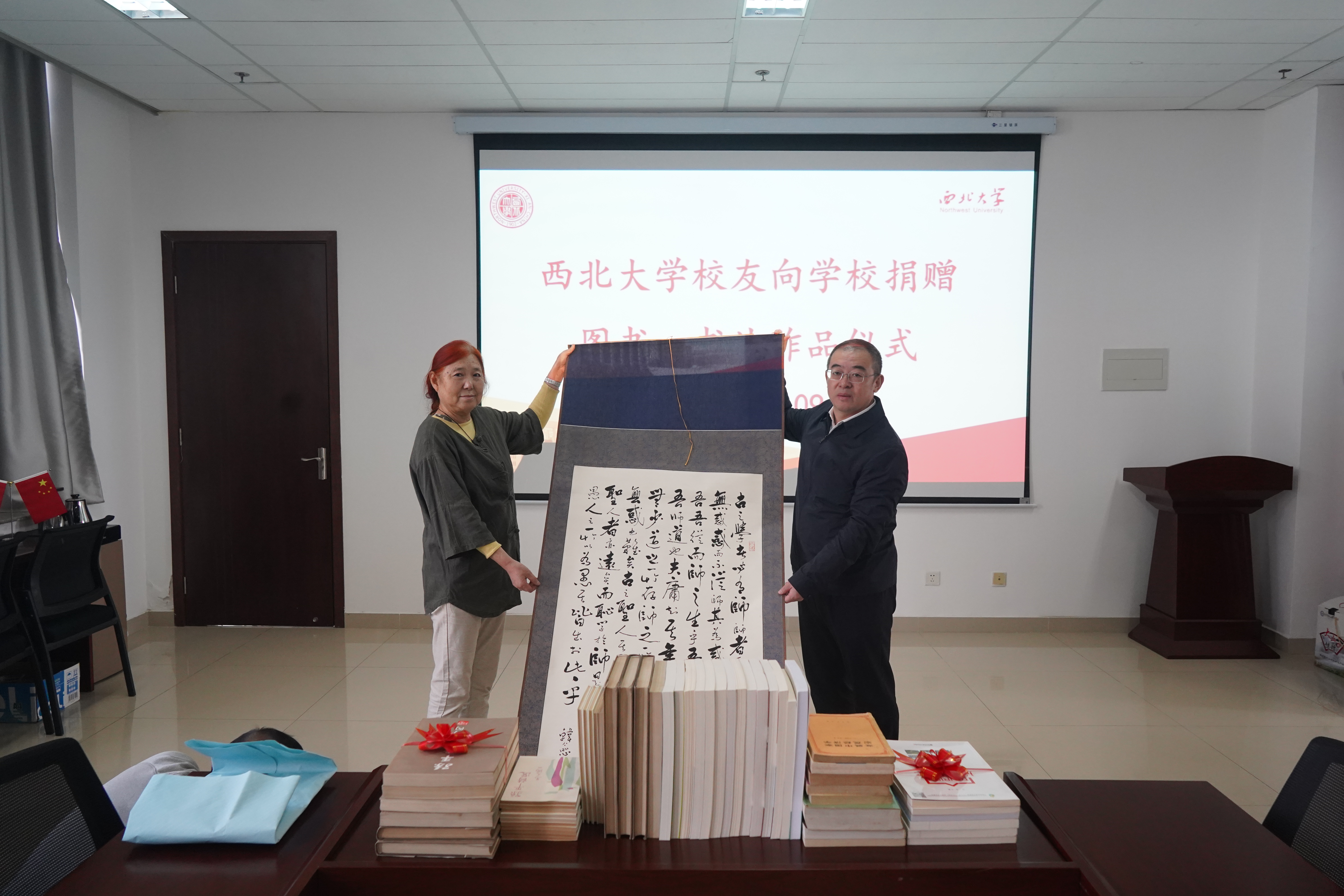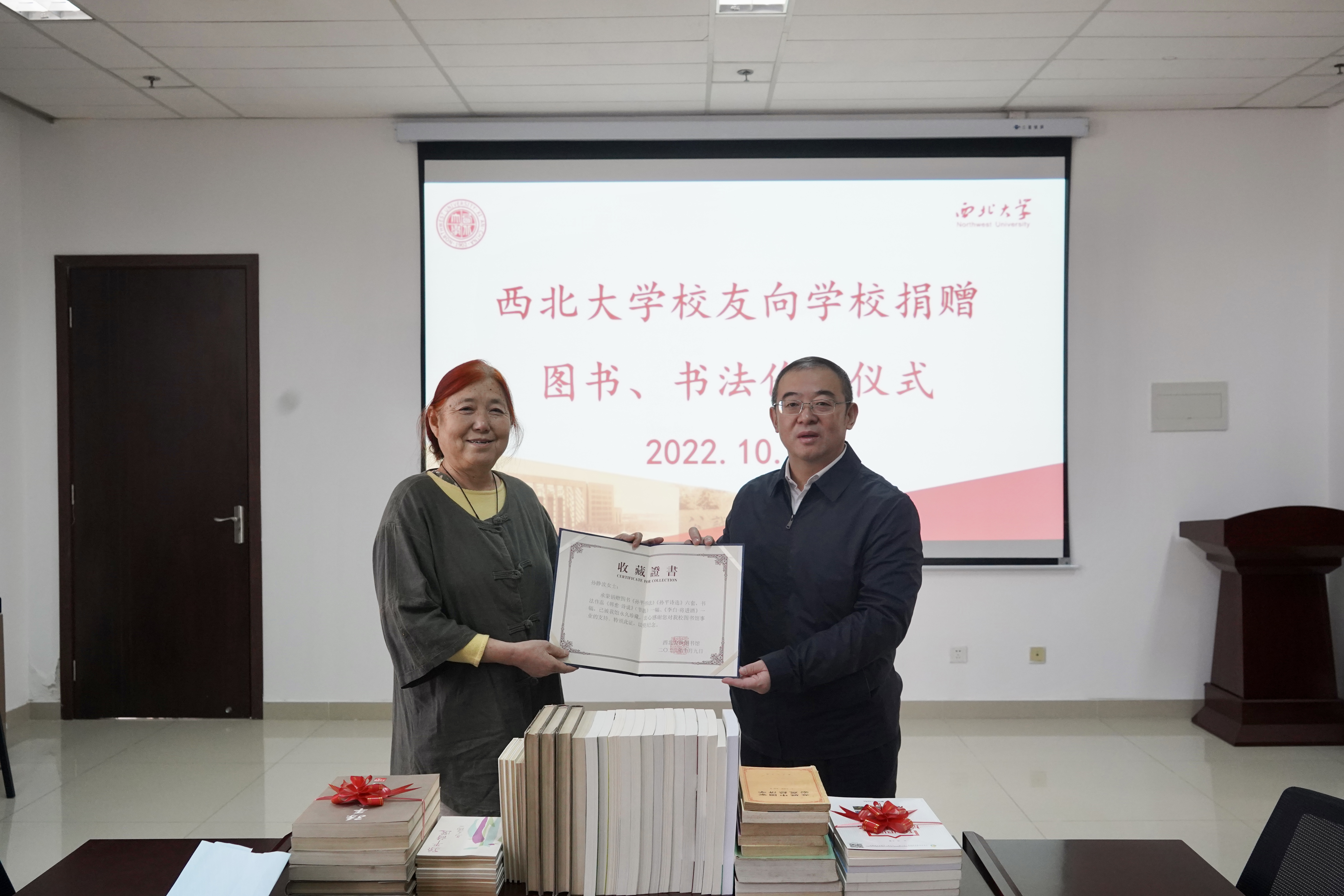 10月9日上午,beat365官网校友向学校捐赠图书、书法作品仪式在长安校区举行。校党委常委、副校长常江,校友孙静波、刘伟,校庆办、经管学院、国内处、图书馆负责人参加活动。仪式由图书馆负责人主持。