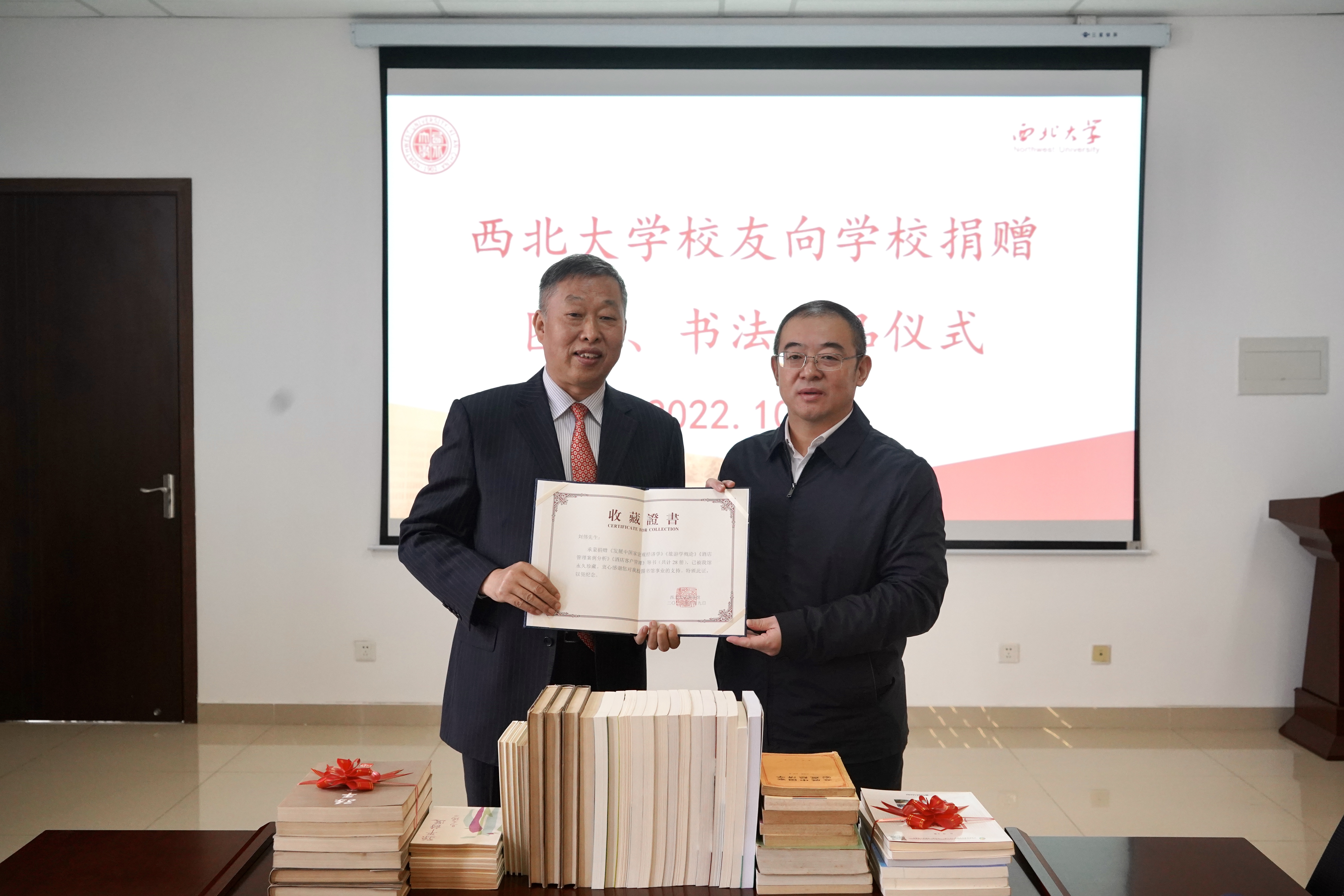 仪式上,长安大学人文学院退休教师孙静波调研员(孙平之女); 广州市优秀专家、广东金融学院国际旅游与休闲管理研究院院长、beat365唯一官网客座教授、博士生导师、 经济管理学院85级校友刘伟教授分别向学校捐赠了孙平先生著作、书法作品和刘伟先生本人著作。常江代表学校接受捐赠,并向两位校友颁发了捐赠证书。