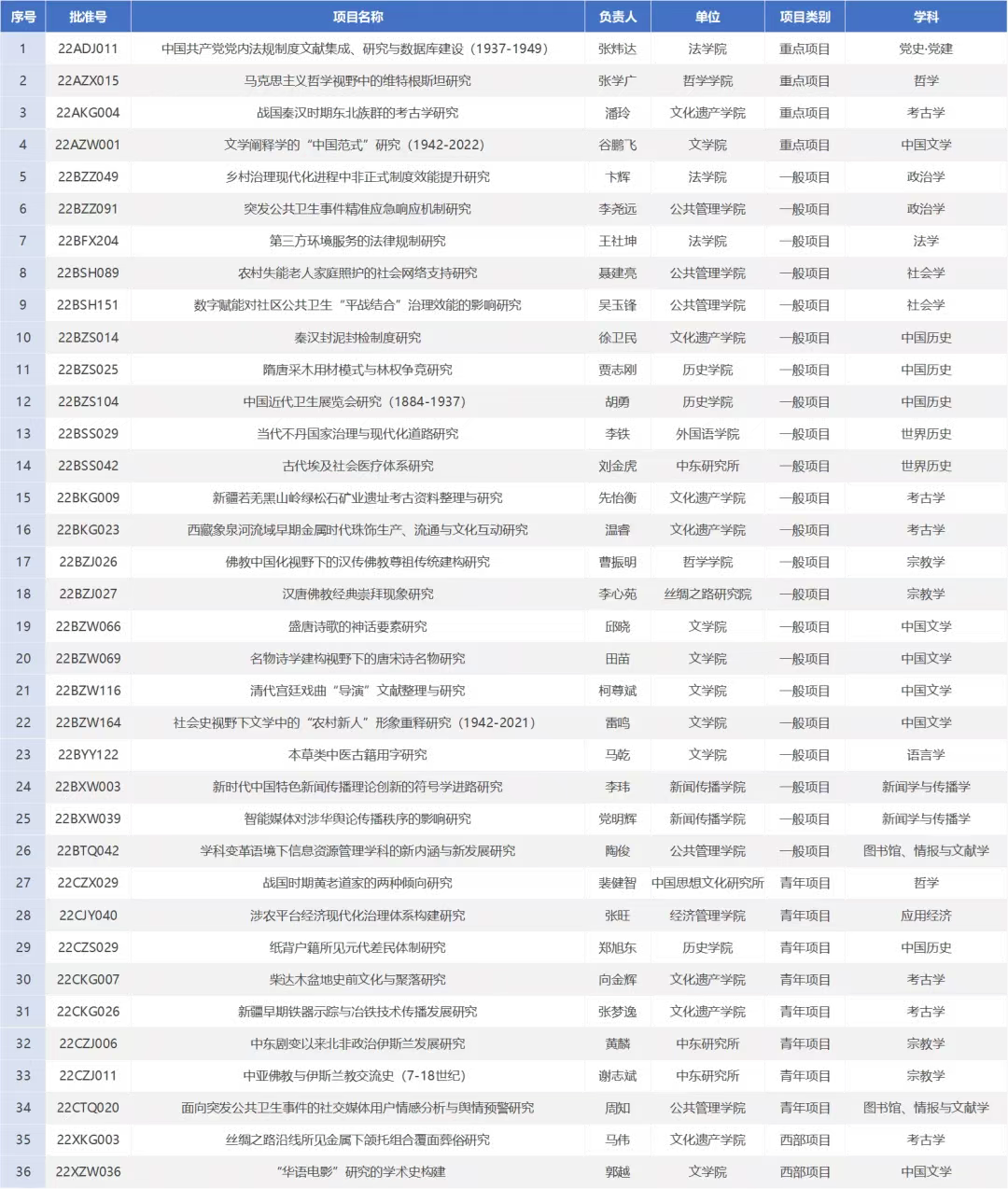 本次立项的36项项目中,考古学、中国文学各6项,宗教学、中国历史各4项,哲学、政治学、社会学、世界历史、新闻学与传播学、图书馆·情报与文献学各2项,党史·党建、应用经济、法学、语言学各1项。在保持传统优势学科的基础上,其他学科显著提升,全面发展。据悉,beat365唯一官网考古学、宗教学两个学科的立项数位居全国第一。