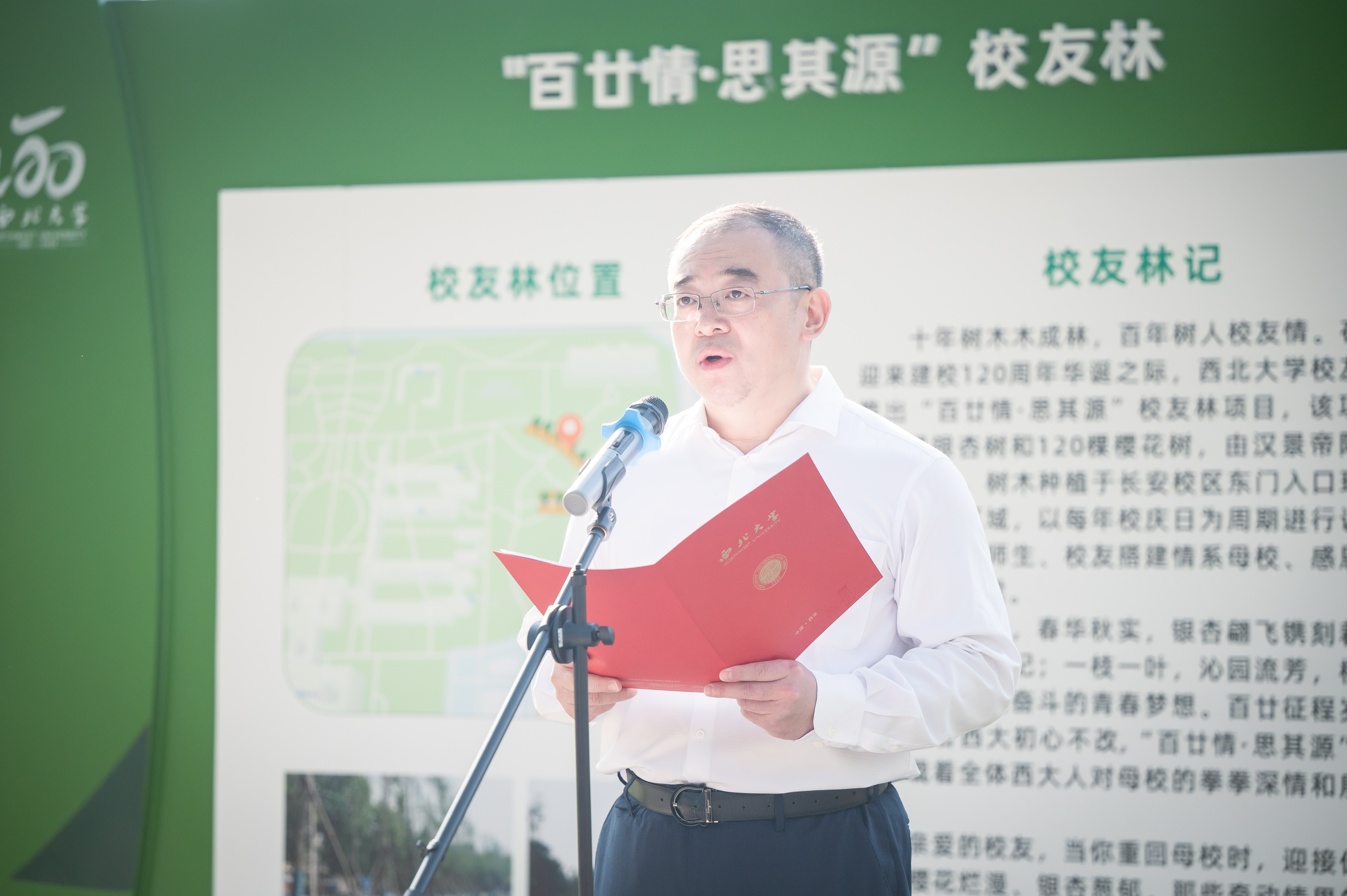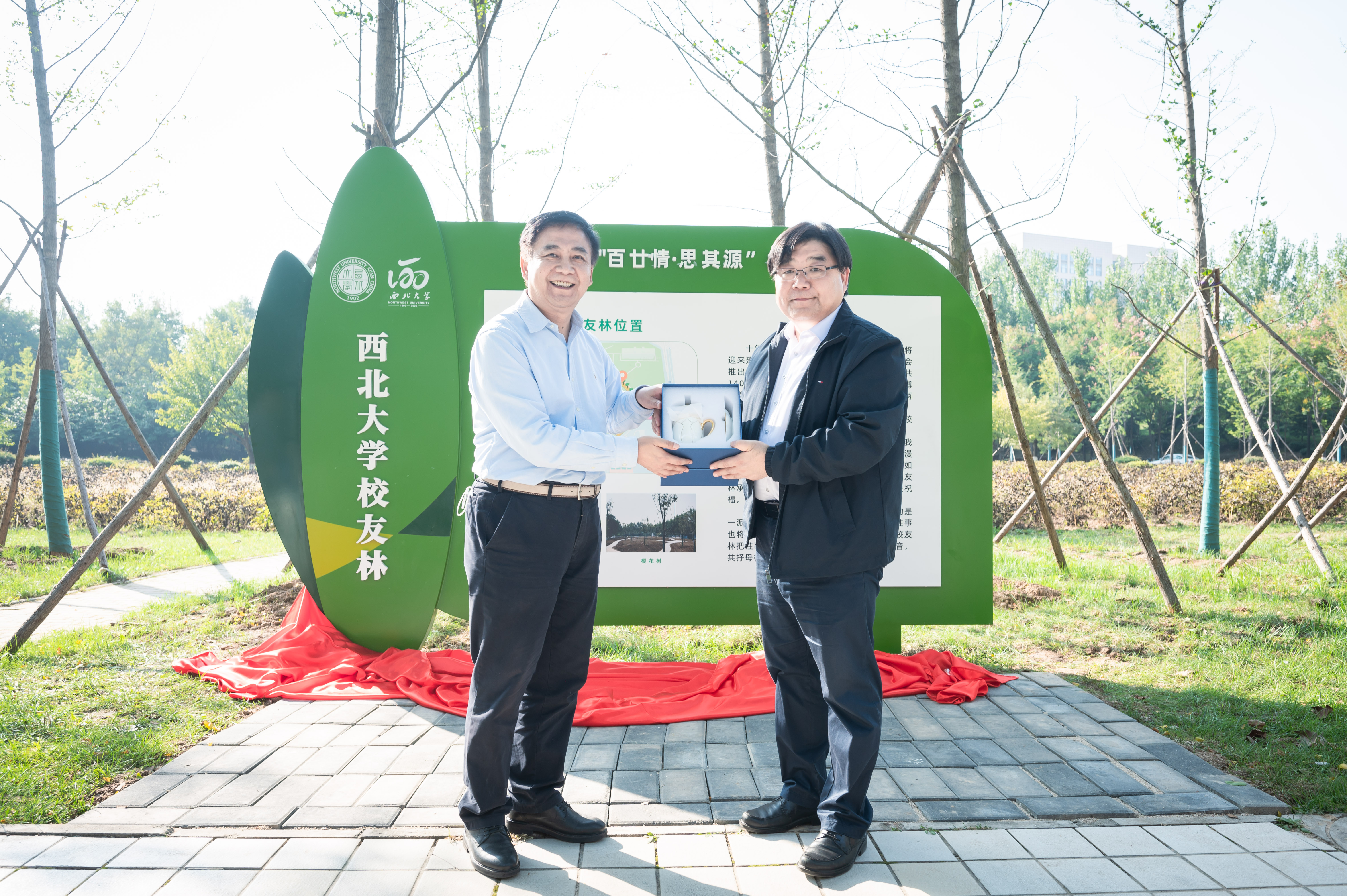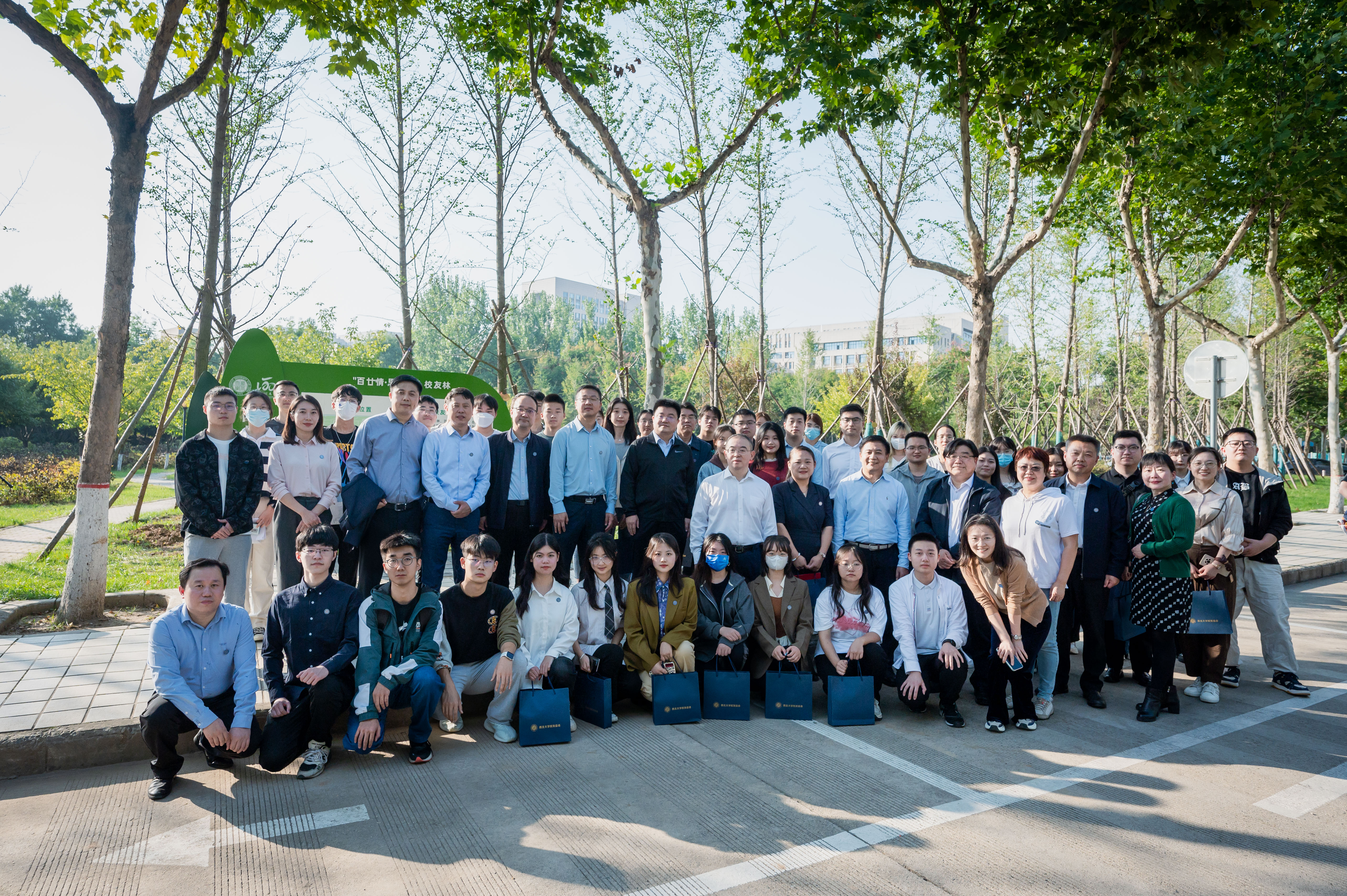9月25日下午,学校在长安校区举行“百廿情·思其源”校友林揭牌仪式。校党委书记王亚杰,校党委常委、副校长吴振磊,汉景帝阳陵博物院院长、1989级校友李举纲,校庆办、学工部、研工部、国内处、后勤集团等部门负责人以及参与本次校友林认养的校友代表、师生代表参加揭牌仪式。校党委常委、副校长、120周年校庆总指挥常江主持仪式。