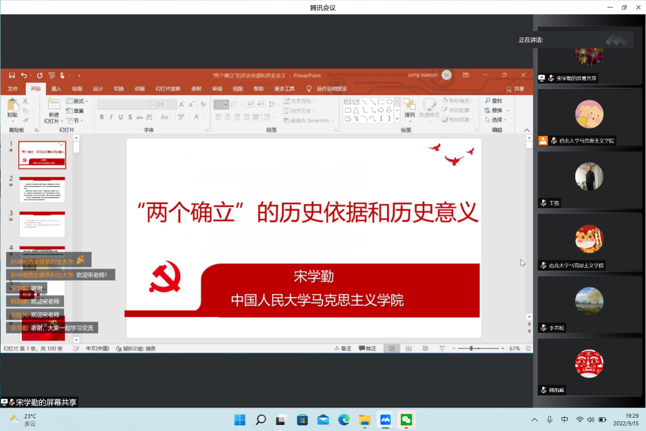 9月15日晚,宋学勤应邀做客beat365官网“侯外庐学术讲座”第239讲,为师生作了题为“‘两个确立’的历史依据与历史意义”的精彩报告。报告由马克思主义学院王强教授主持,马克思主义学院党委中心组成员和学院师生、部分院系2021级本科生在“习近平新时代中国特色社会主义思想概论”课堂上在线参加了本次报告会。