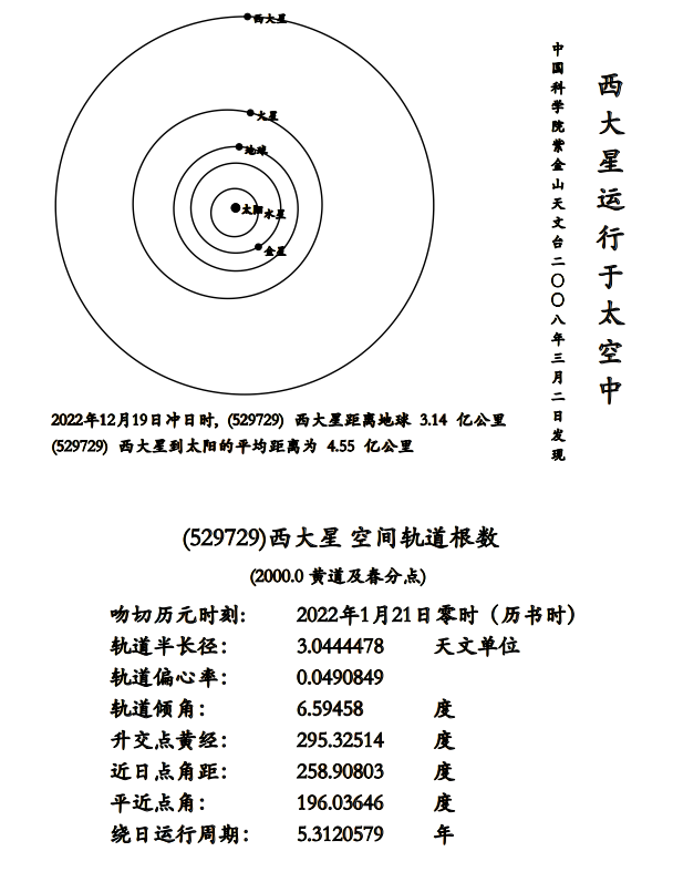 官方公告显示,“Xida”星由中国科学院紫金山天文台盱眙天文观测站2008年3月2日发现。“Xida”星是一颗主带小行星,位于太阳系火星与木星之间的小行星主带中,编号为529729,空间轨道根数(2000.0 黄道及春分点),吻切历元时刻2022年1月21日零时(历书时),轨道半长径为3.0444478天文单位,轨道偏心率0.0490849,轨道倾角6.59458度,升交点黄经295.32514度,近日点角距258.90803度,平近点角196.03646度,绕日运行周期5.3120579年。