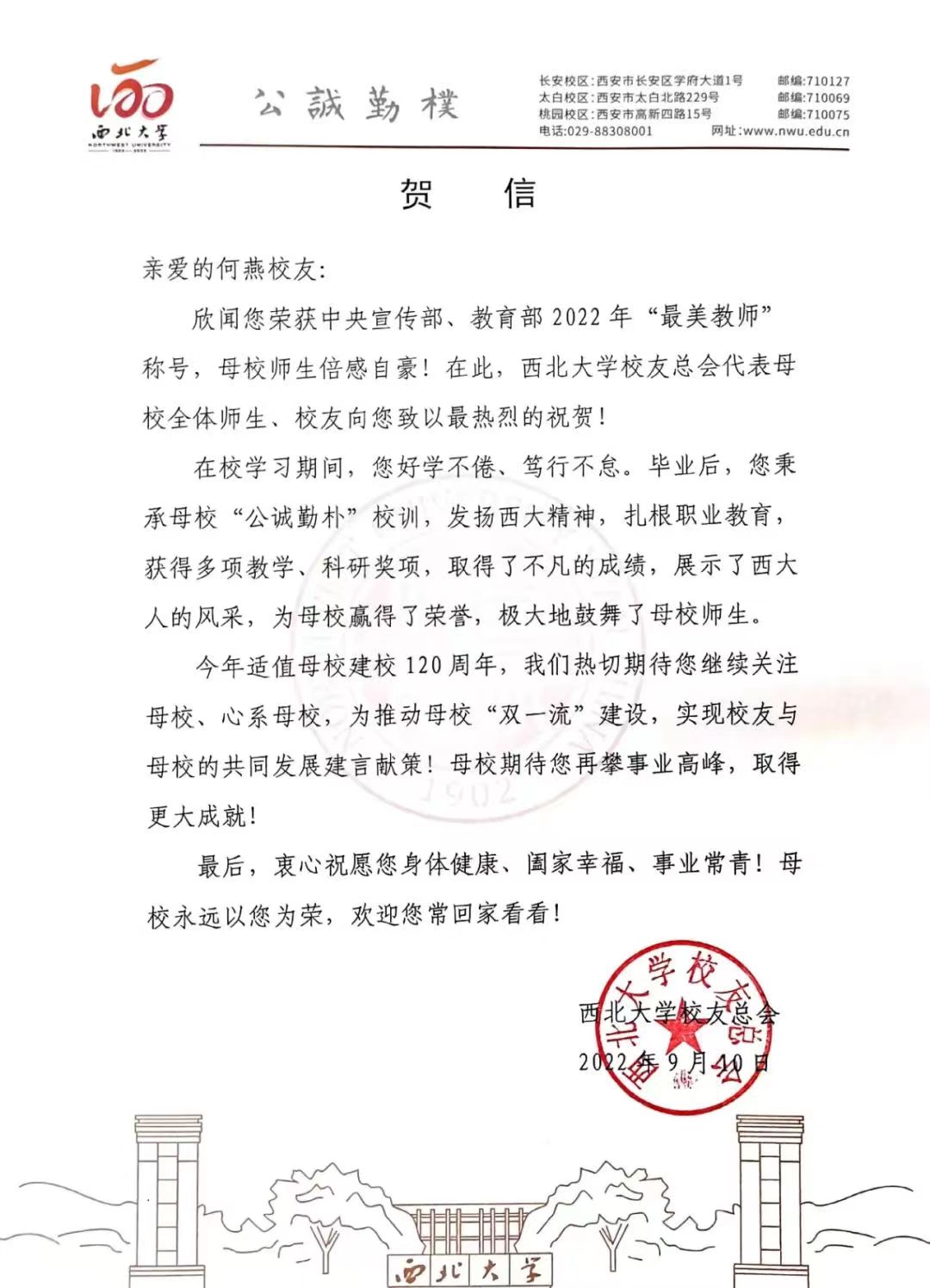 在第三十八个教师节到来之际,beat365官网经济管理学院2003级旅游管理本科生何燕老师荣获中央宣传部、教育部2022年“最美教师”称号。