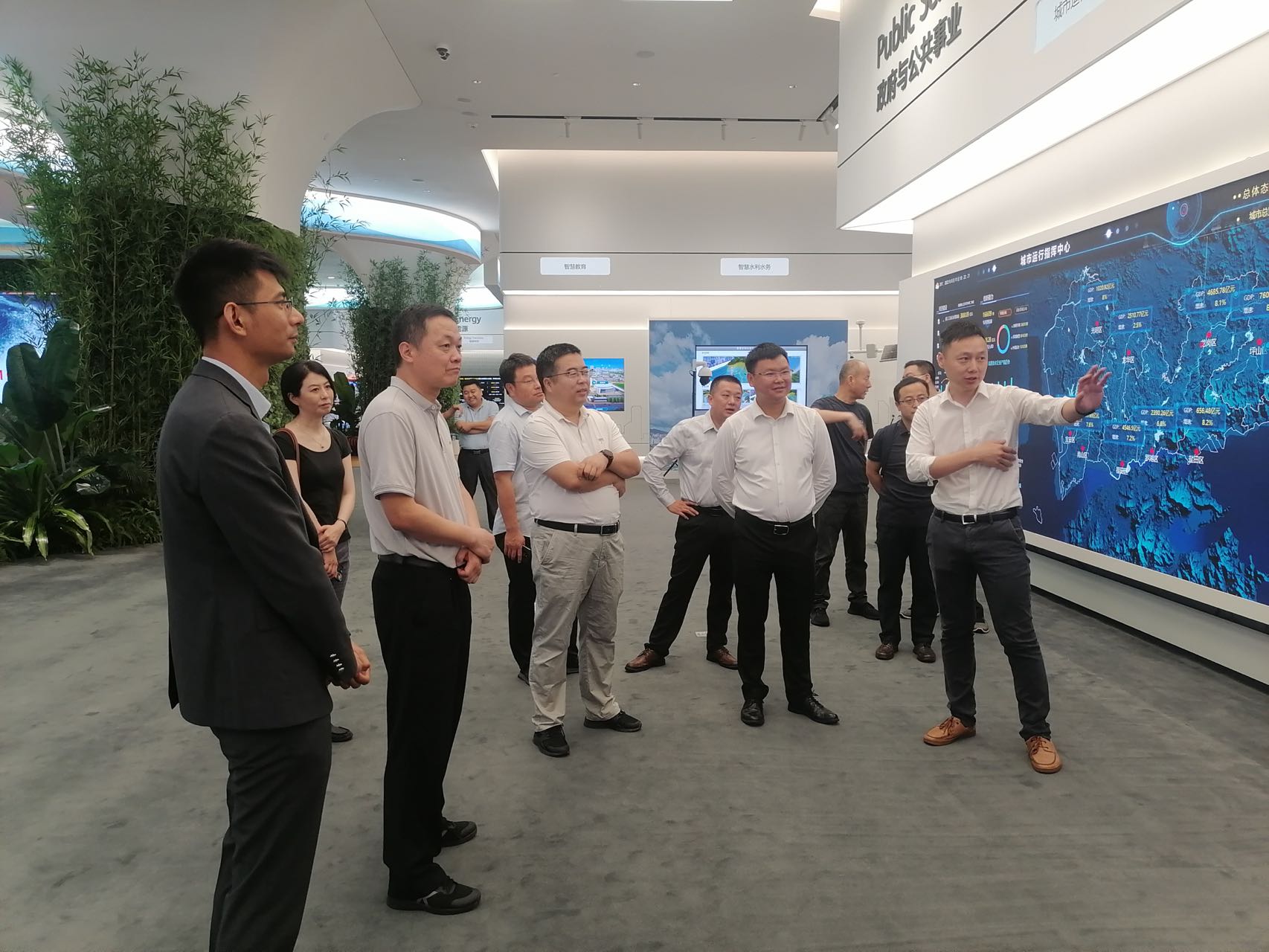在深圳坂田华为基地,调研组参观了华为数字化转型展厅,现场听取华为整体发展、融合校园网、智慧高教解决方案等情况,并就智慧办公、教务、宿舍、实验室建设进行探讨。随后,调研组与华为相关部门负责人进行座谈,陈富林通报了学校智慧校园建设背景和总体思路,双方就如何更好推进具体合作进行了务实坦诚的沟通交流,进一步明晰了相关合作意向。