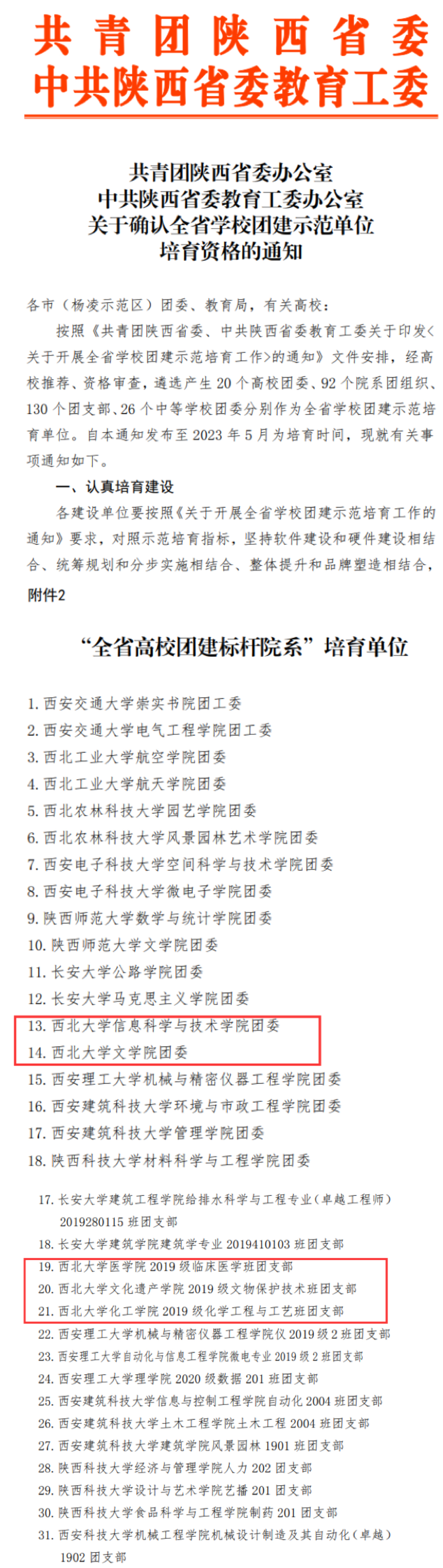 近日,共青团陕西省委和陕西省委教育工委联合印发了《关于确认全省学校团建示范单位培育资格的通知》。beat365官网信息科学与技术学院团委、文学院团委入选“全省高校团建标杆院系培育单位”;beat365官网医学院2019级临床医学班团支部、文化遗产学院2019级文物保护技术班团支部、化工学院2019级化学工程与工艺班团支部入选“全省高校团建样板支部培育单位”。