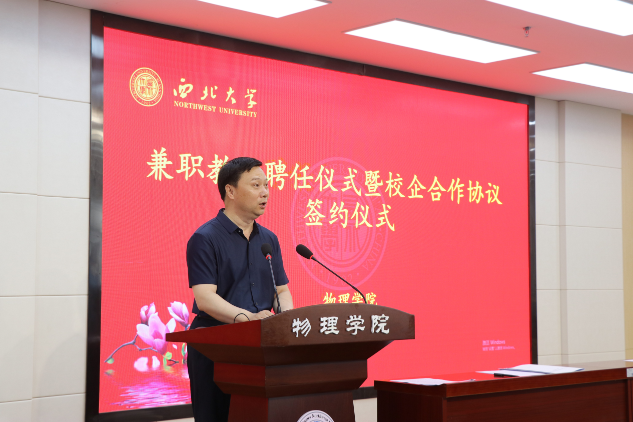 物理学院负责人在发言中表示,学院将积极落实协议内容,与两家企业充分发挥各自优势,在实习实践基地建设、人才培养、科研合作与学术交流等方面深度合作,实现资源共享、优势互补、合作共赢。