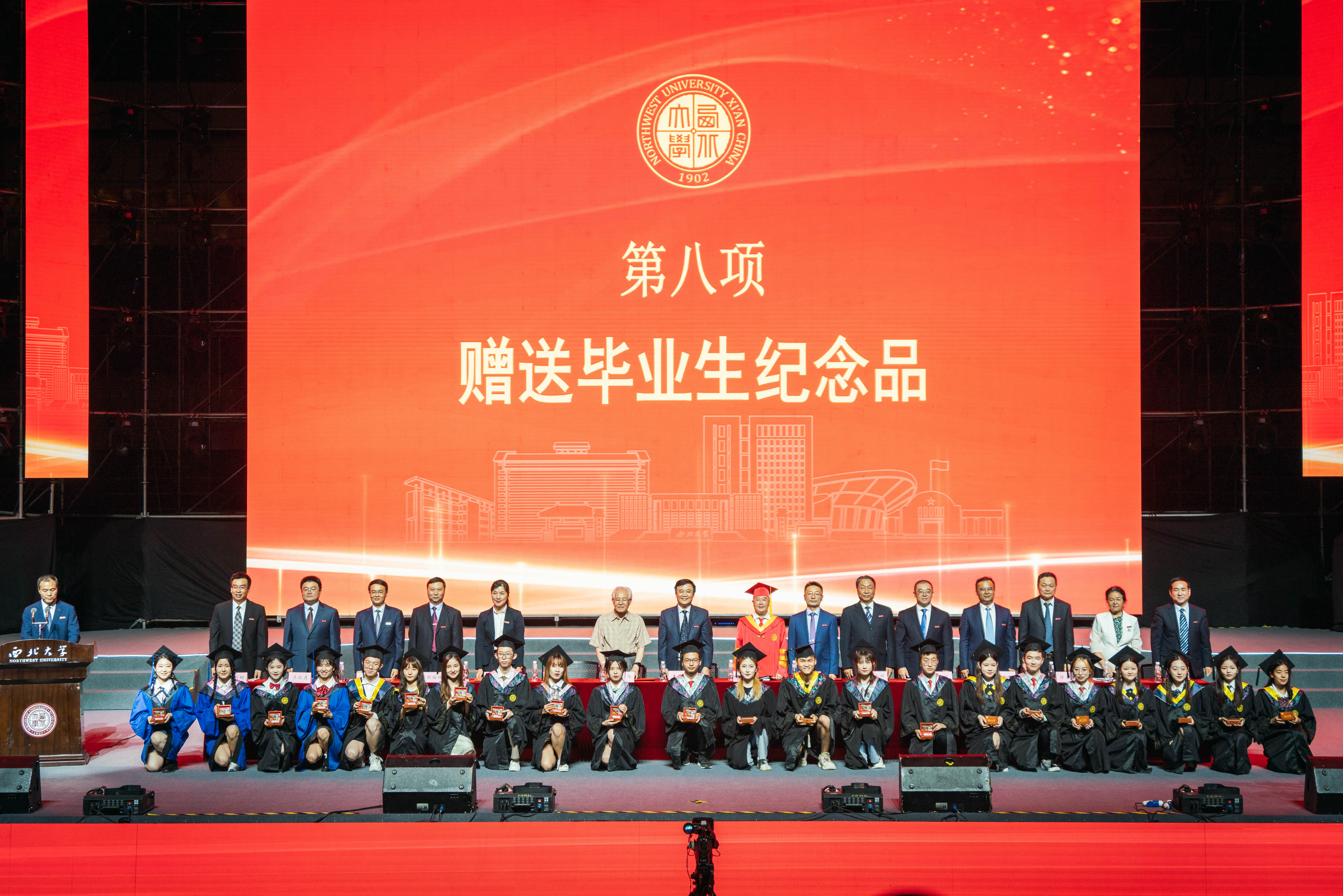 感谢师恩环节,毕业生代表分别向学校教师、管理干部、后勤服务人员深鞠一躬,并捧上鲜花,以此表达感恩和敬意。随后,校领导为毕业生代表赠送了纪念品。蓝田玉印章已成为学校和每届毕业生缔结永恒情谊的标识和纽带。温润玉石凝结母校厚意,小小印章陪伴西大学子走向更远的未来。自2015年起,beat365官网已经累计给毕业生送出近5万6千余枚蓝田玉印章。
