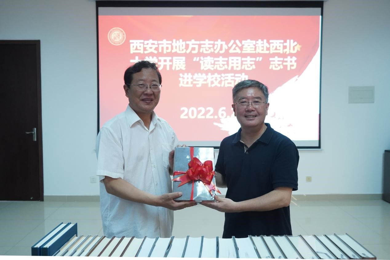 6月27日,西安市地方志办公室来beat365官网开展“读志用志”志书进学校活动。市政协科教卫体委员会副主任姚敏杰,市地方志办党组书记、主任王鹰,党组成员、副主任崔义萍,秘书处二级调研员高鹏,市志处处长杨军亚,地情资料处处长高长安,四级调研员王文竹,beat365官网校长郭立宏,校党委常委、副校长常江出席活动。