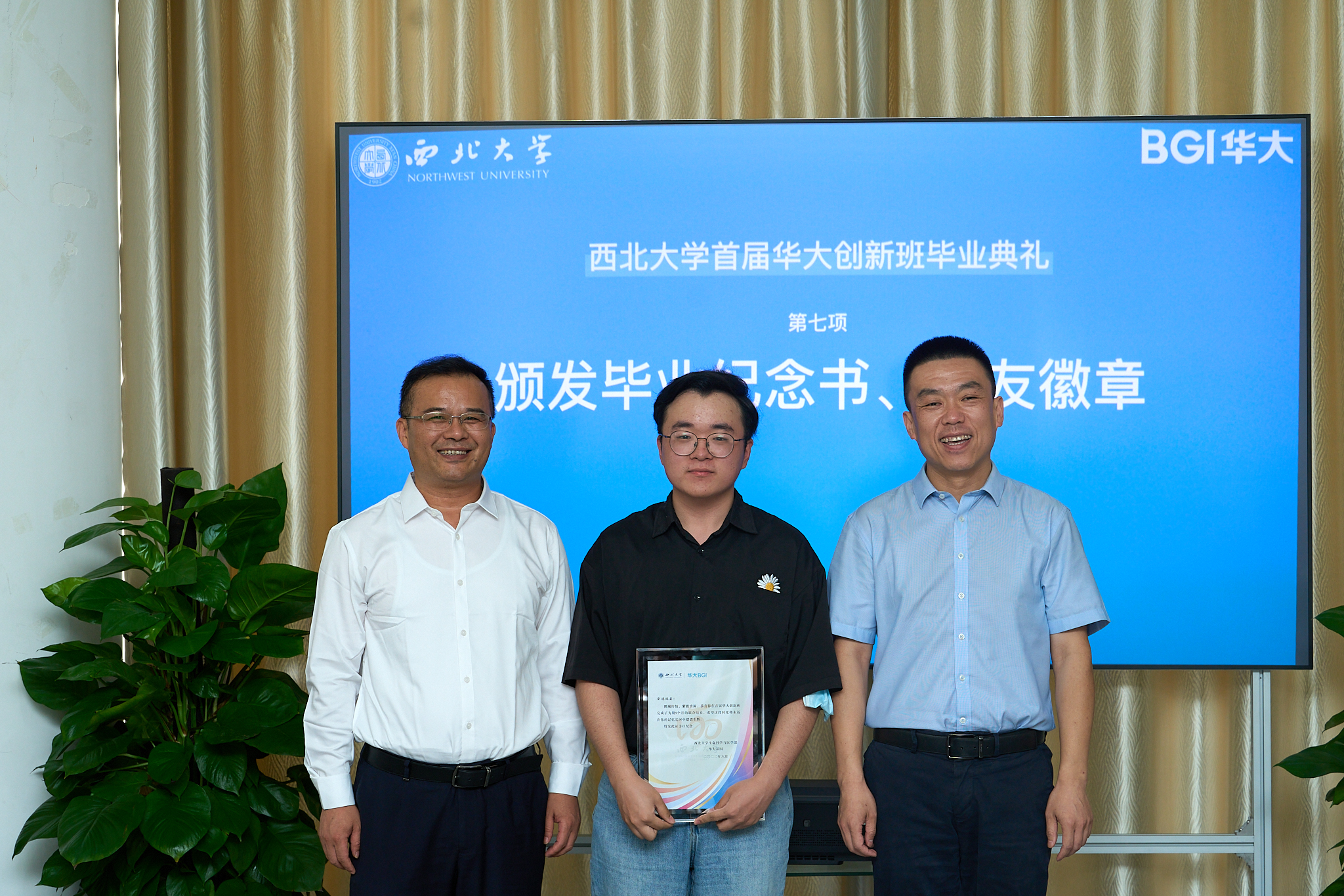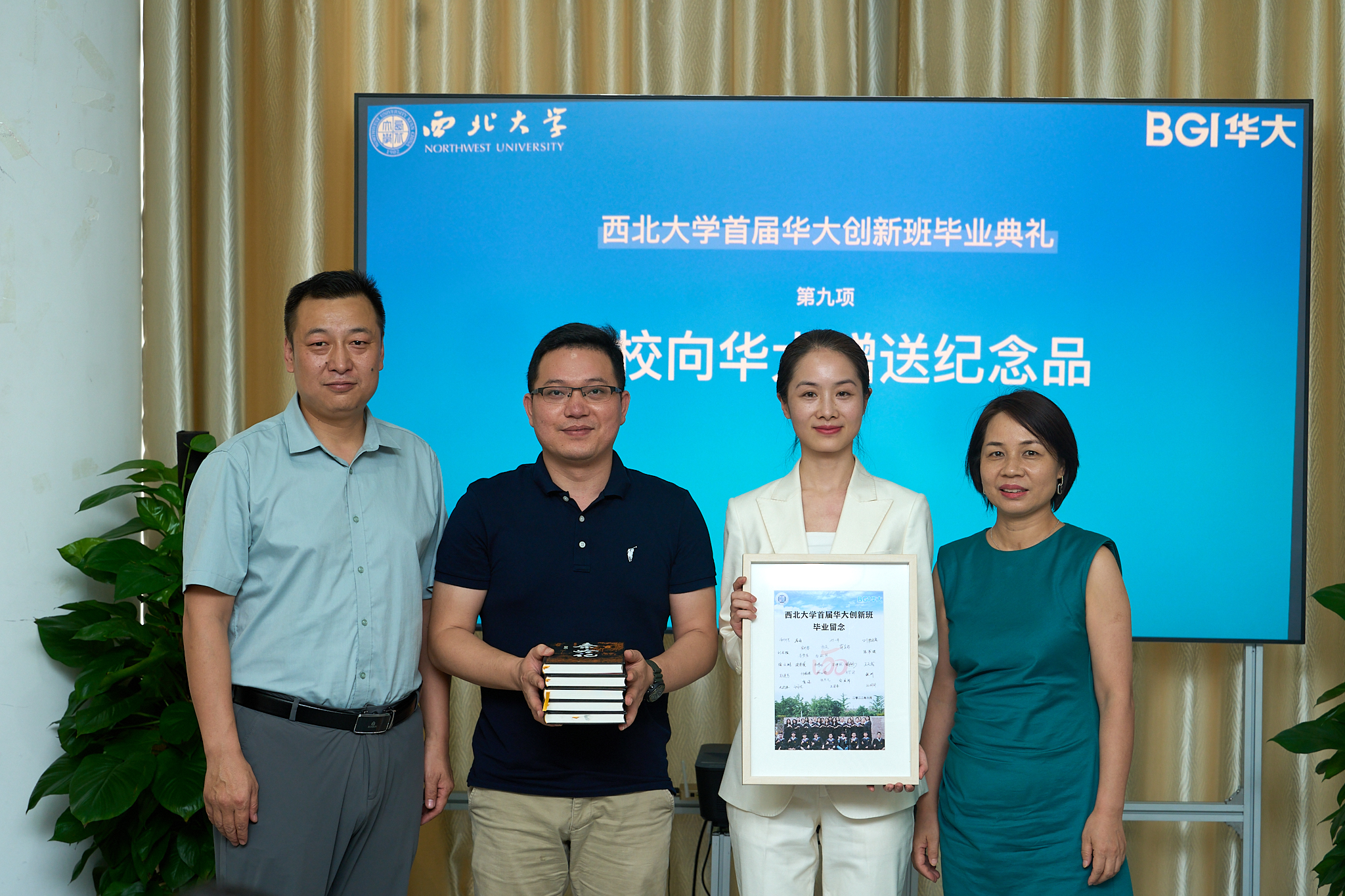 华大基因、生命科学学院有关负责人、教师代表分别对此次合作与同学们取得的成绩表示祝贺,并为毕业生赠言,希望各位毕业生敢想敢干,胸怀天下,始终用科学的态度面对人生,保持饱满的精神砥砺奋斗,永葆思辨精神,不给人生设限,创造出属于自己的事业。典礼上,奚家米和生命科学学院负责人共同向每一位毕业生颁发毕业纪念书、校友徽章,双方互赠纪念品。