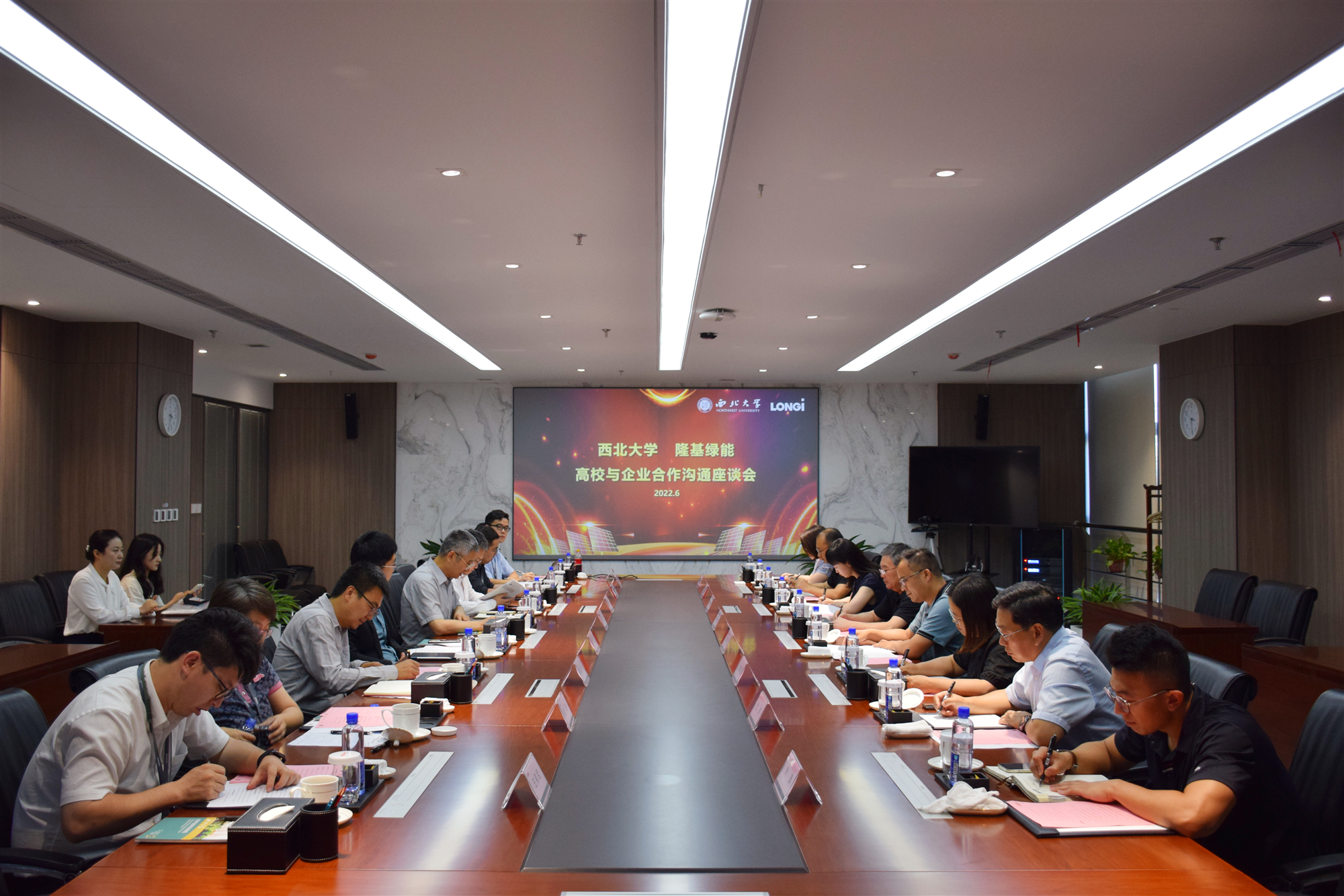 6月16日,校长郭立宏,校党委常委、副校长奚家米,就创中心负责人,物理学院、化学与材料学院、经济管理学院、历史学院负责人和就创中心工作人员等一行9人赴隆基绿能科技股份有限公司交流座谈。隆基绿能科技股份有限公司副总裁李文学,人力资源管理中心副总经理马福海等参加座谈。