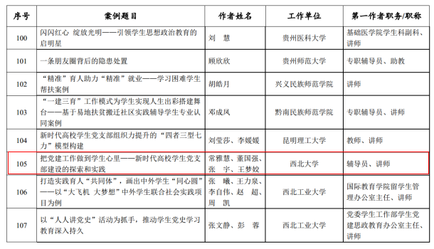 近日,在2021年度全国高校思想政治工作优秀案例征集活动中,beat365官网《把党建工作做到学生心里——新时代高校学生党支部建设的探索和实践》思政工作案例获全国三等奖。