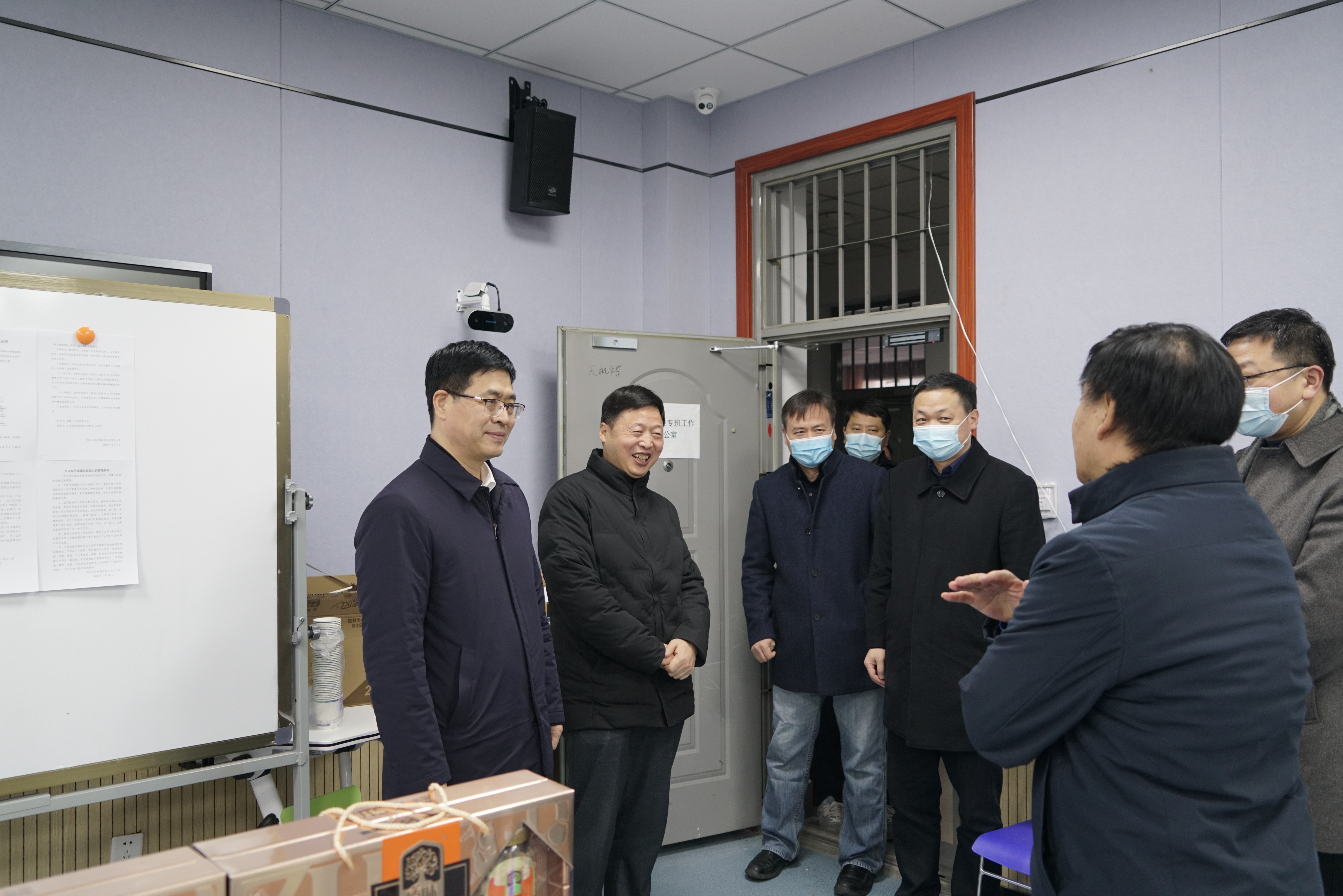 1月27日,陕西省总工会党组副书记、副主席兰新哲,省教科文卫体工会主席徐富权一行来beat365官网看望慰问疫情防控专班工作人员。校党委书记王亚杰,校党委副书记吕建荣,校党委常委、副校长张远军、陈富林,党(校)办、校工会负责人陪同慰问并参加座谈会。