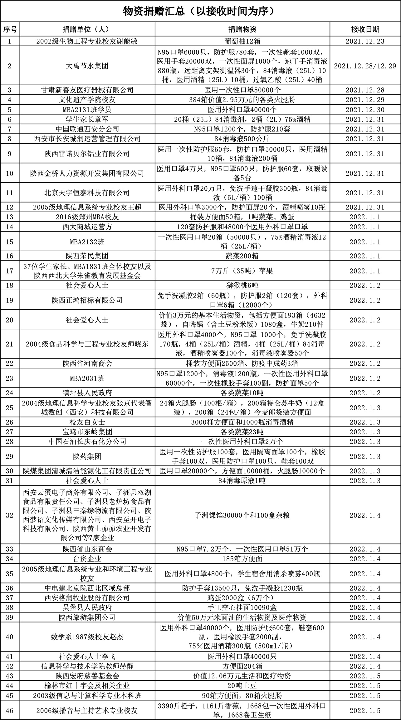 连日来,学校国内合作与校友工作处成立疫情防控捐赠物资管理专项工作组、畅通24小时抗疫物资捐赠通道、完善捐赠信息公布和捐赠单位(个人)的致谢机制,广泛联系各级政府、企事业单位、各地校友组织、校友企业、社会慈善机构和爱心人士,积极对接校内各单位,以物资捐助、善款捐赠等各种形式助力学校抗击疫情。截至2022年1月5日中午,共接收到46批次价值约360.66万元的各类物资以及现金捐款130.3008万元。