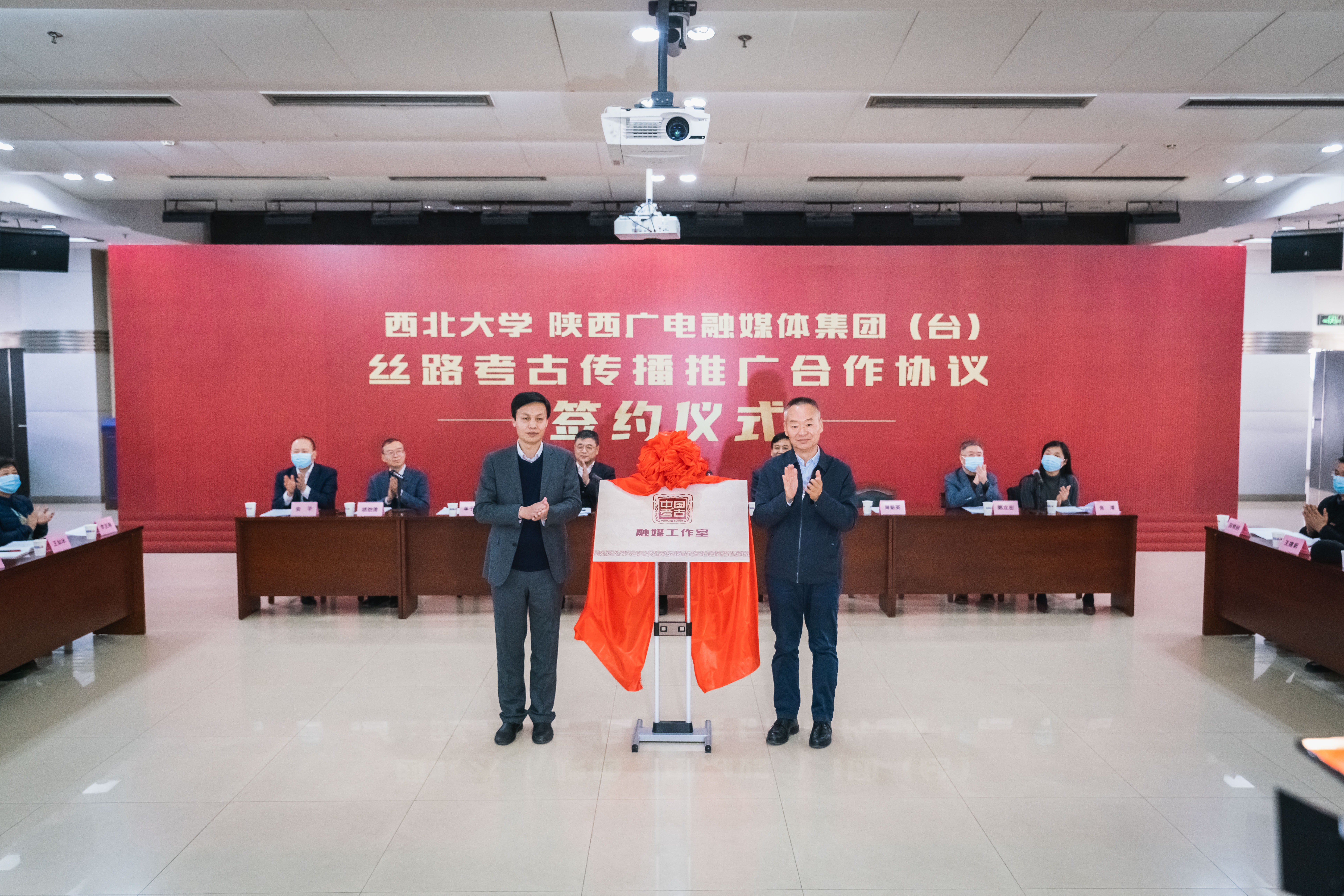 郭立宏、安平代表双方签署《beat365唯一官网 陕西广电融媒体集团(台)丝路考古传播推广合作协议》。周魁英、单子孝共同为《中国·考古》融媒工作室揭牌。