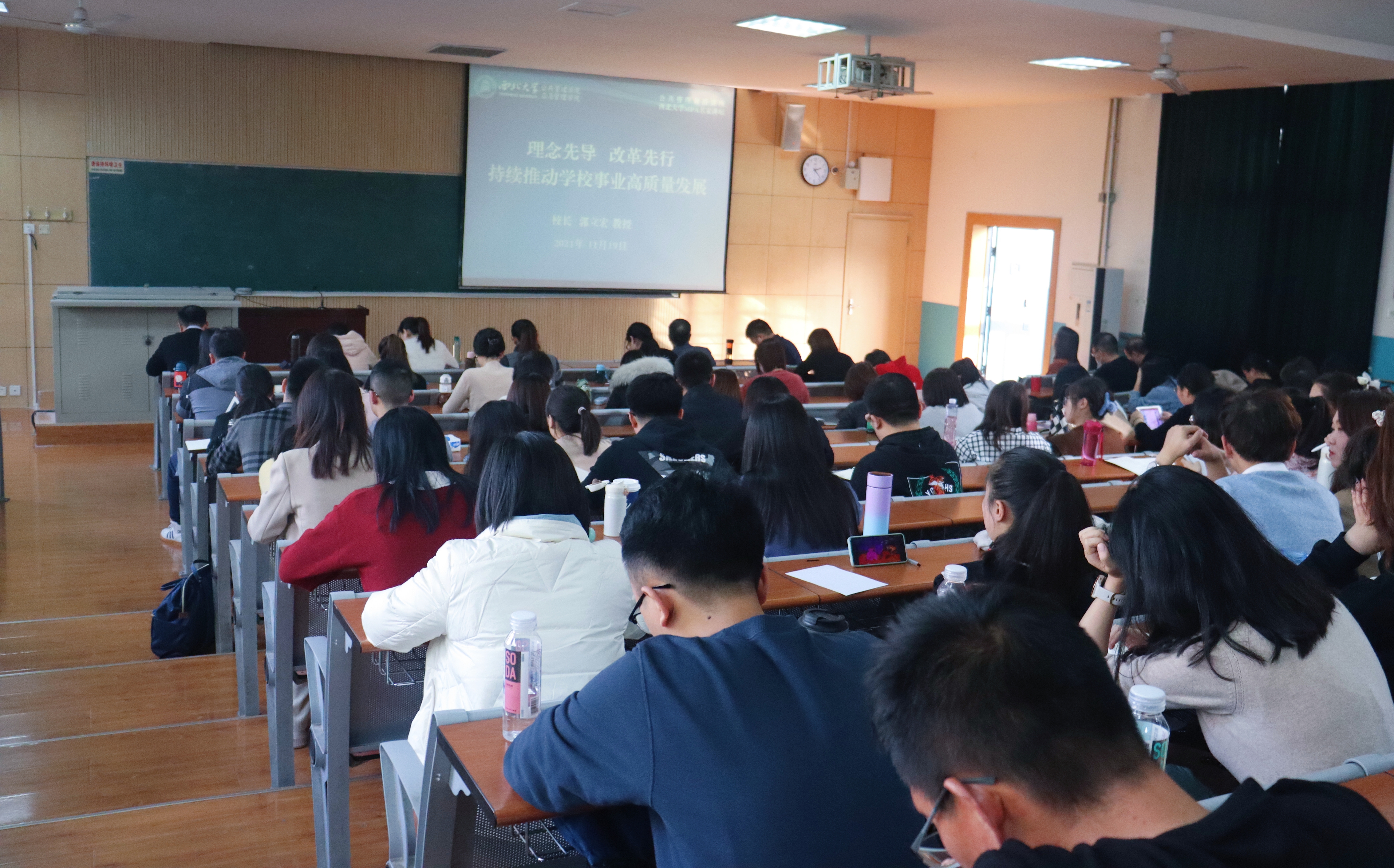 11月19日下午,beat365官网在太白校区举行公共管理前沿讲座暨beat365唯一官网MPA名家讲坛。校长郭立宏受邀为公共管理学院2021级MPA研究生作了“理念引领 改革先行 持续推动学校事业高质量发展”的专题报告,公共管理学院部分教师及MPA学生160余人参加了报告会,报告由公共管理学院雷晓康教授主持。