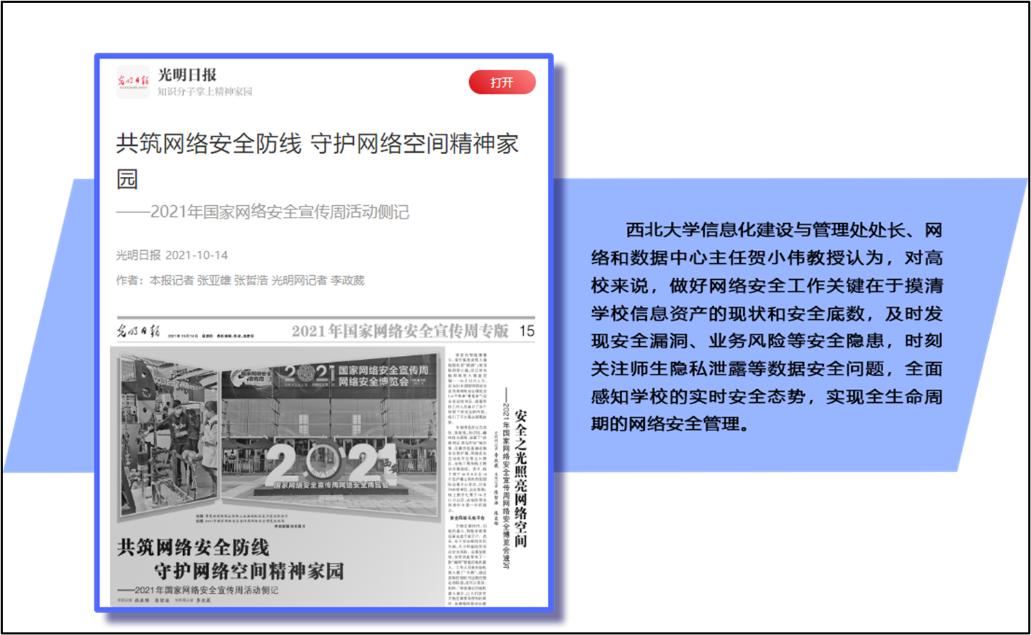 在光明日报10月14日刊发的《共筑网络安全防线 守护网络空间精神家园》文章中,引用了beat365官网贺小伟教授对高校网络安全工作的理解和观点:“对学校来说,做好网络安全工作关键在于摸清学校信息资产的现状和安全底数,及时发现安全漏洞、业务风险等安全隐患,时刻关注师生隐私泄露等数据安全问题,全面感知学校的实时安全态势,实现全生命周期的网络安全管理。”