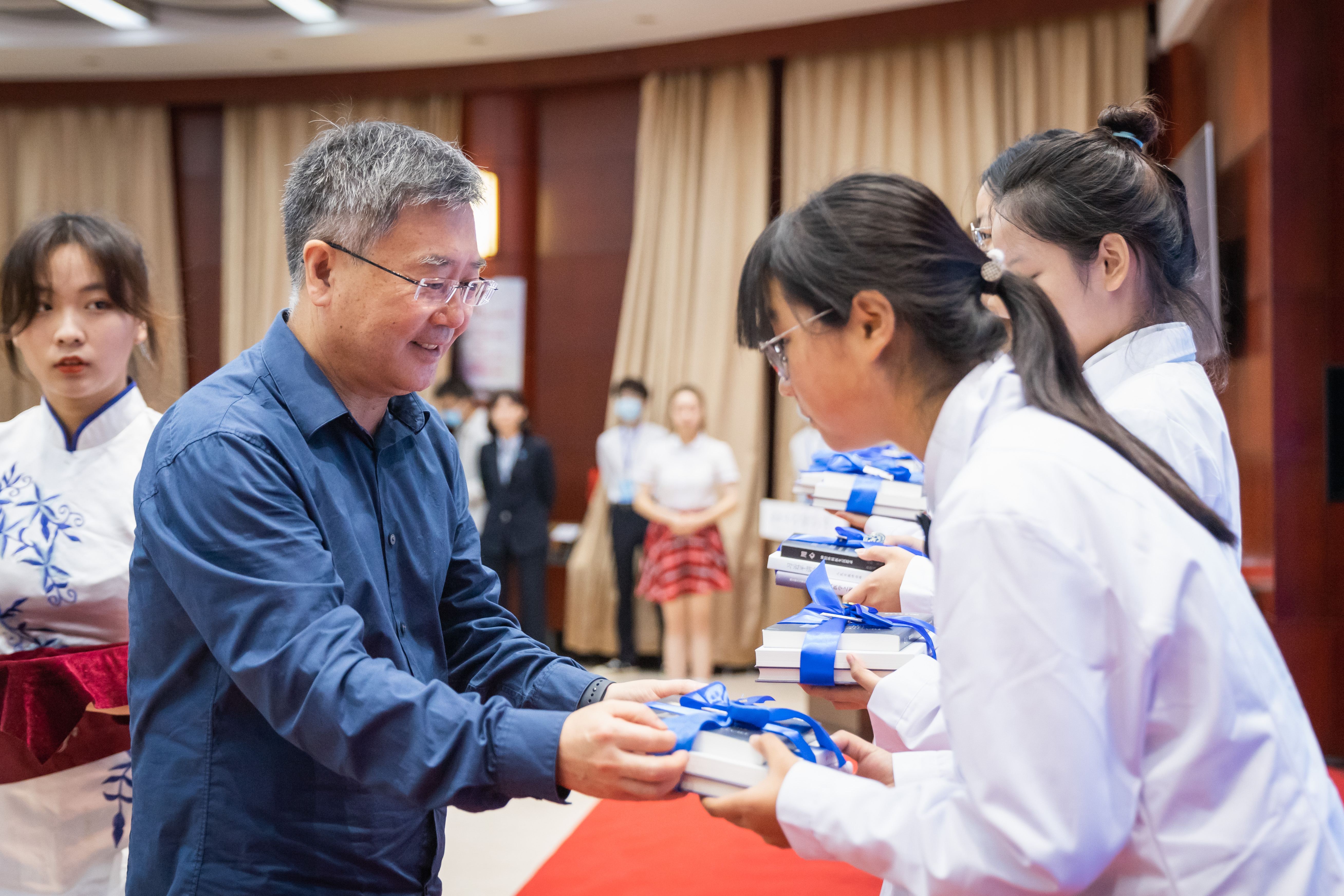 郭立宏向新生颁发校徽、赠送书籍,为医学生开启漫漫医学求知和探索之路。