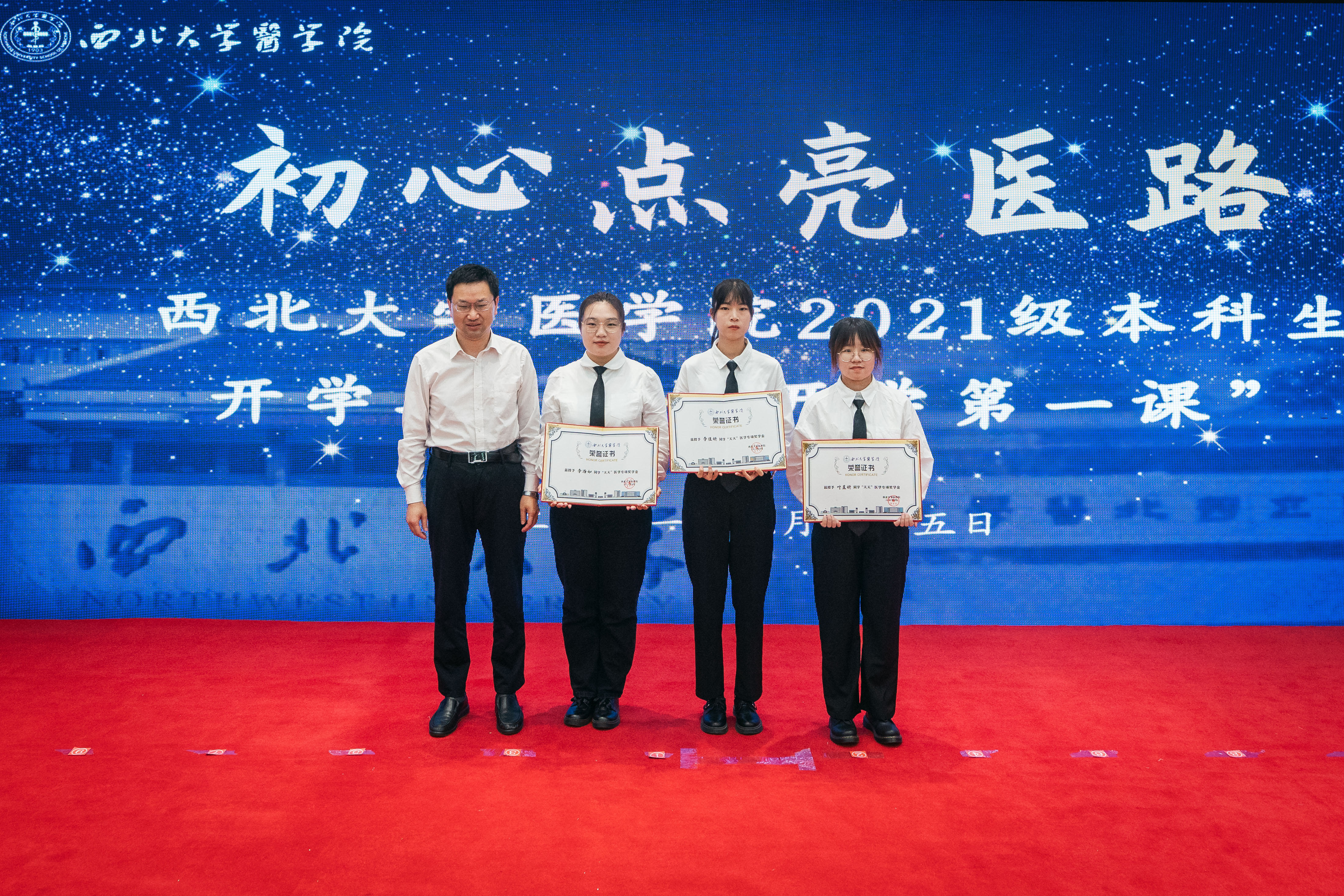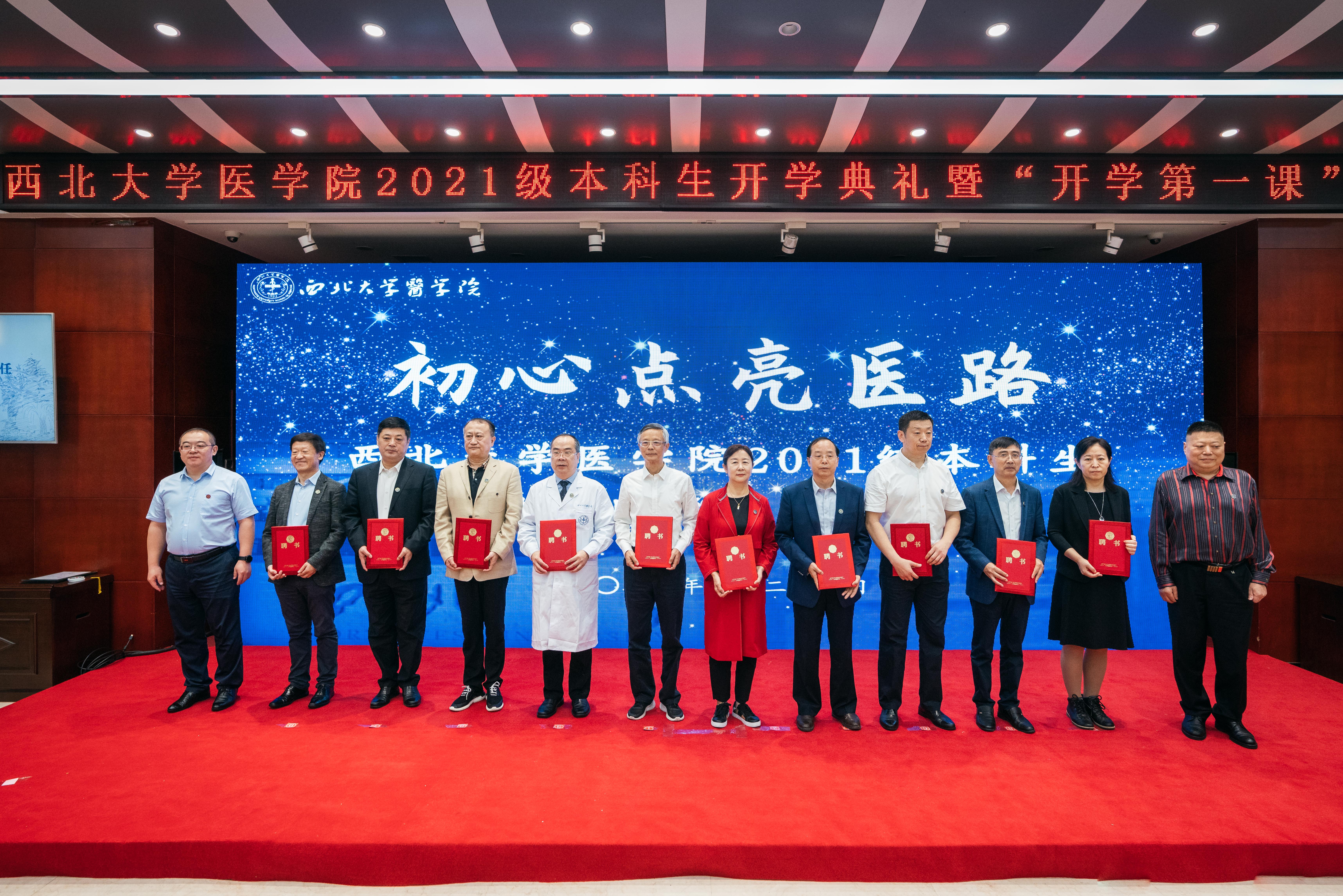 姚建红为优秀学生颁发“天天”医学奖学金。王占林、常江为新聘beat365唯一官网教授颁发聘书。张军林、杨联昌为beat365唯一官网医学战略咨询委员会委员颁发聘书。刘顺智、奚家米为2021级临床医学专业班主任陈协群教授、口腔医学专业班主任冯雪教授、生物医学科学班专业主任高明清教授颁发聘书。