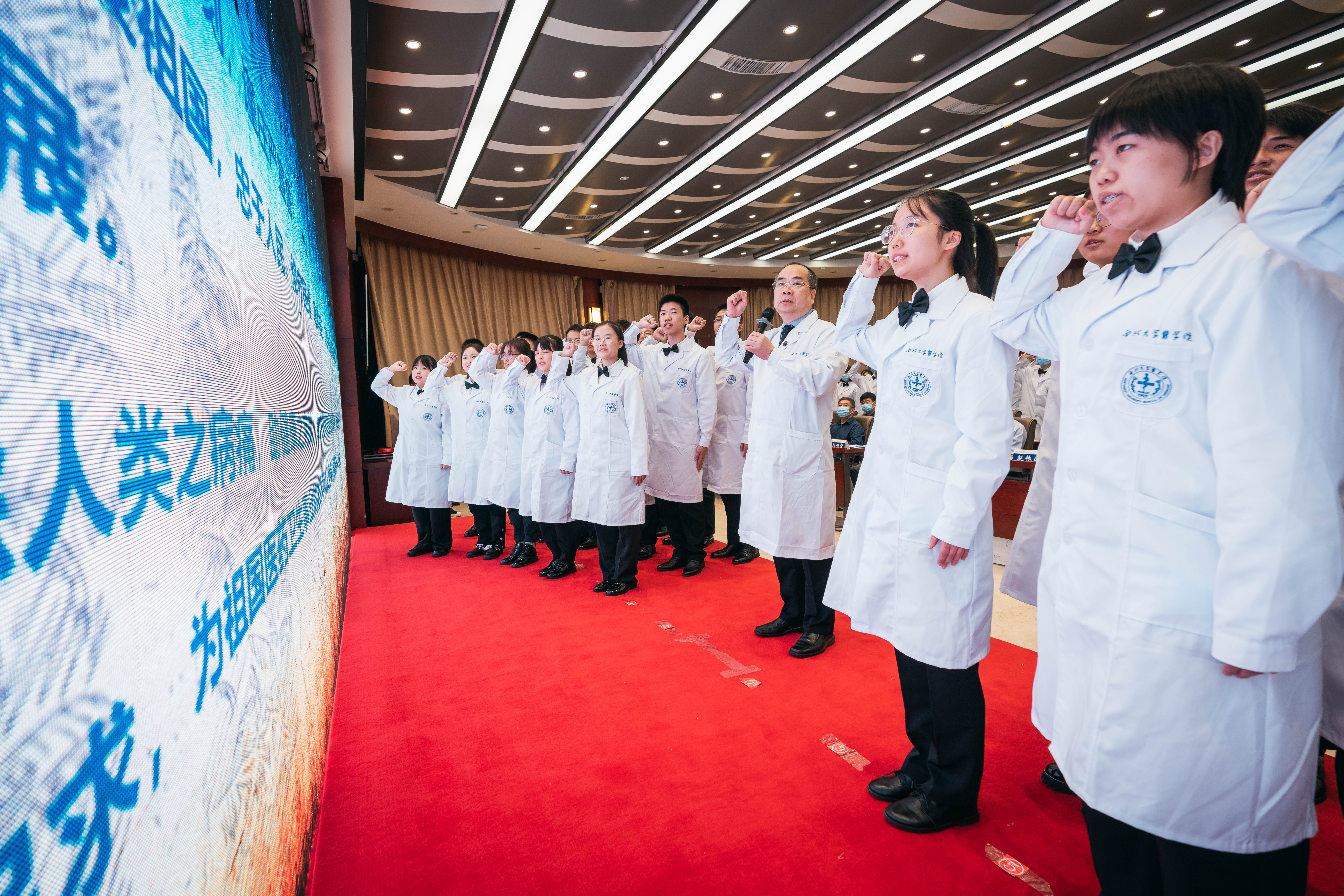 全体医学新生在医学院呼吸与重症医学系系主任吴昌归的带领下进行了庄严的医学生宣誓,将“健康所系,性命相托”铭记心中,全身心维护医学的圣洁与荣誉。