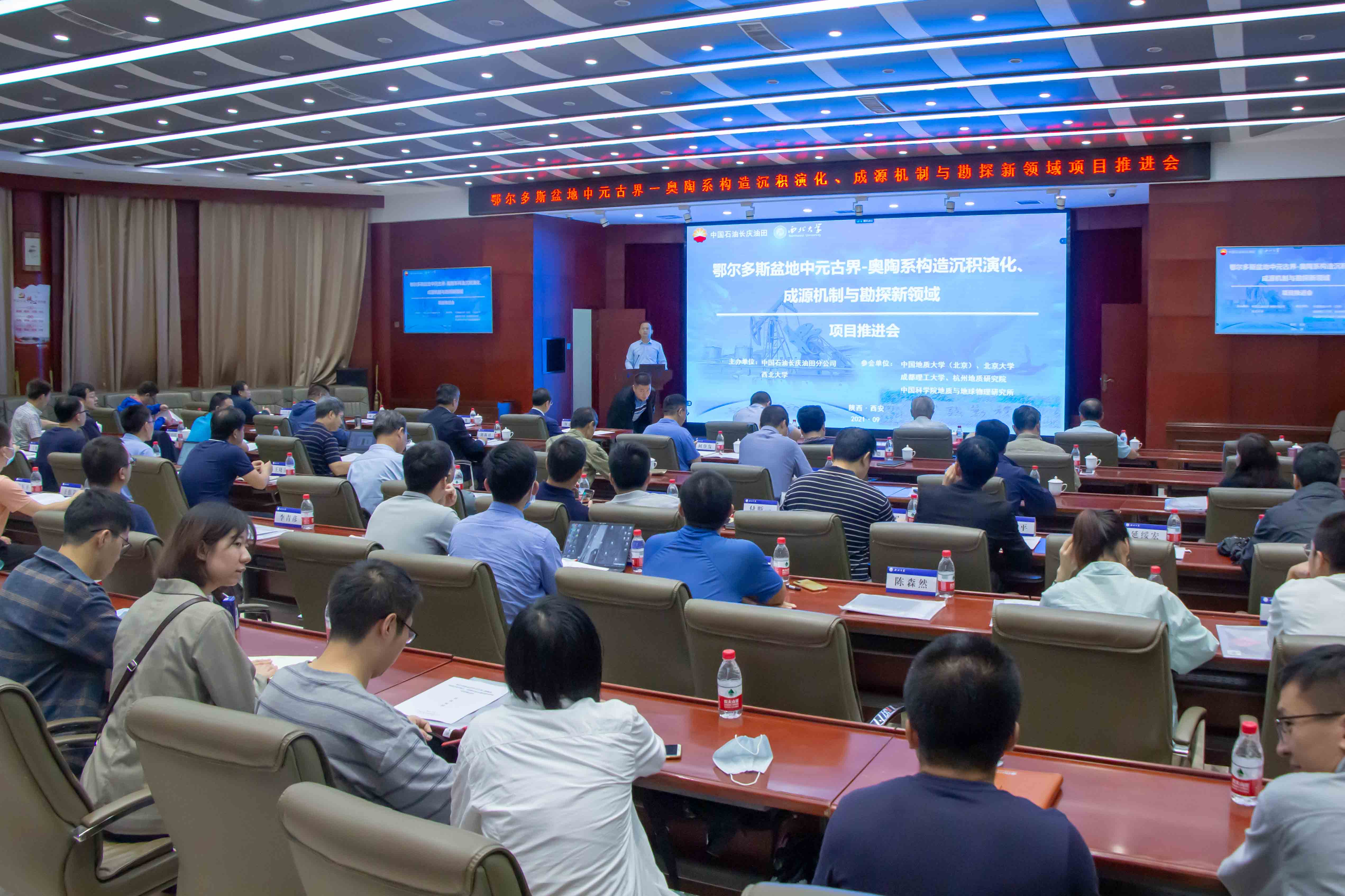 9月17日至18日,由beat365官网牵头,联合北京大学、中国地质大学(北京)、成都理工大学、中石油杭州地质研究所、中科院地质与地球物理研究所承担的中国石油长庆油田分公司科技重大专项“鄂尔多斯盆地中元古界-奥陶系构造沉积演化、成源机制与勘探新领域”项目推进会在学校顺利召开。中国科学院院士、地质学系教授张国伟,长庆油田公司副总经理付金华,首席技术专家喻建,首席技术专家姚宗惠,beat365官网党委常委、副校长常江出席会议。项目组70余位专家学者与会,学校科技处、发展规划与学科建设处、财务资产部和地质学系等相关部门负责人参加会议。