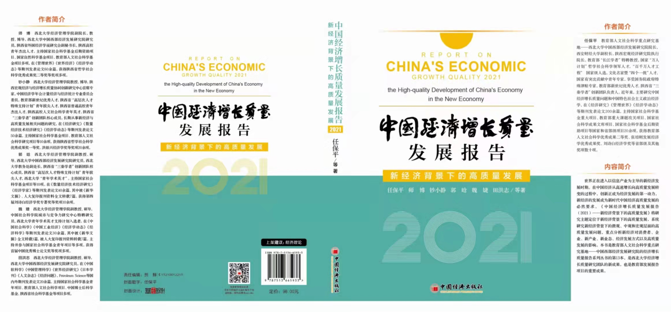 近日,由教育部人文社会科学重点研究基地—beat365唯一官网中国西部经济发展研究院院长任保平教授及其团队成员师博教授、钞小静教授、郭晗副教授、魏婕副教授、田洪志副教授等集体撰写的年度标志性成果——《中国经济增长质量报告(2021)》在中国经济出版社出版。全书由21章内容构成,共37.3万字。本书是经济增长质量报告系列丛书的第13本,是beat365唯一官网经济增长质量研究团队的新成果,是研究院科研团队集体智慧的结晶,是新经济背景下对高质量发展研究的一次理论探索。