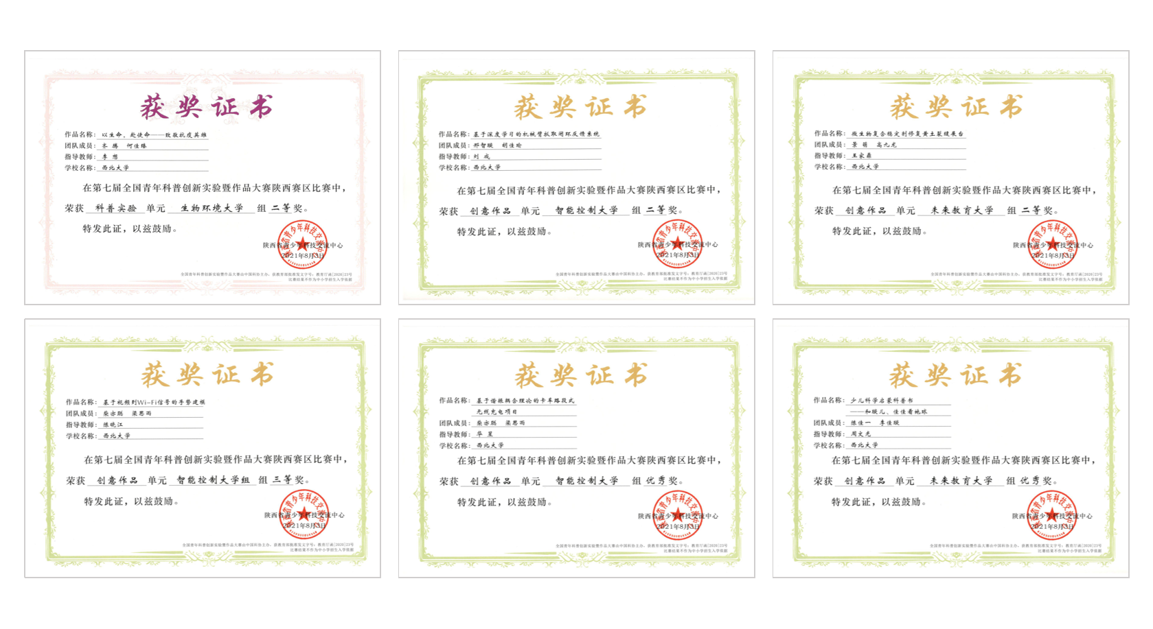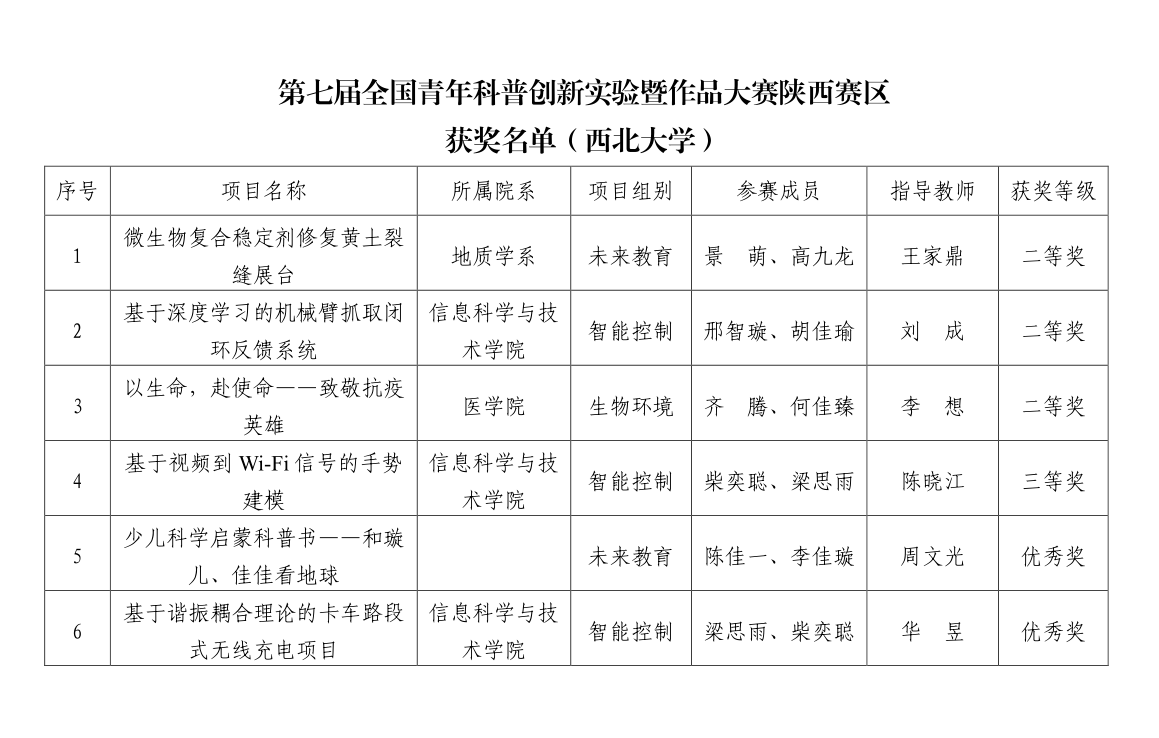 校团委经初赛、复赛、决赛、项目展示等环节选拔培训,共推荐6个项目参赛。最终《微生物复合稳定剂修复黄土裂缝展台》《基于深度学习的机械臂抓取闭环反馈系统》《以生命,赴使命——致敬抗疫英雄》获大赛二等奖;《基于视频到Wi-Fi信号的手势建模》获大赛三等奖;《少儿科学启蒙科普书——和璇儿、佳佳看地球》《基于谐振耦合理论的卡车路段式无线充电项目》获大赛优秀奖。