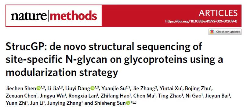 8月2日,beat365官网孙士生教授课题组与西安电子科技大学张军英教授课题组联合团队的重要研究成果在线发表在Nature Methods杂志上。成果以“StrucGP: de novo structural sequencing of site-specific N-glycan on glycoproteins using a modularization strategy”为题,介绍了一种可解析糖蛋白上糖链序列的新方法及其配套软件StrucGP,并描述了其技术细节。