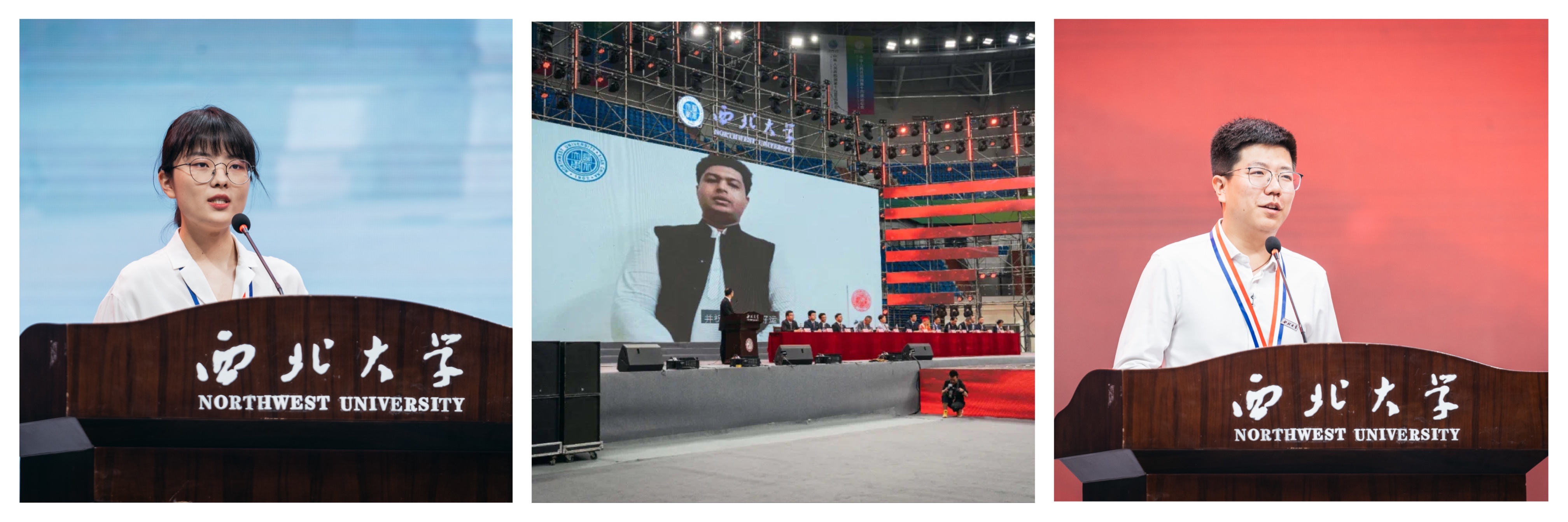 2021届毕业本科生代表文学院王鹤桦、研究生代表化工学院赵浩安和受疫情影响通过视频形式发表毕业感言的留学生毕业生代表秦天,深情回顾了在母校奋斗成才的故事,表达了对母校的感恩与惜别之情。