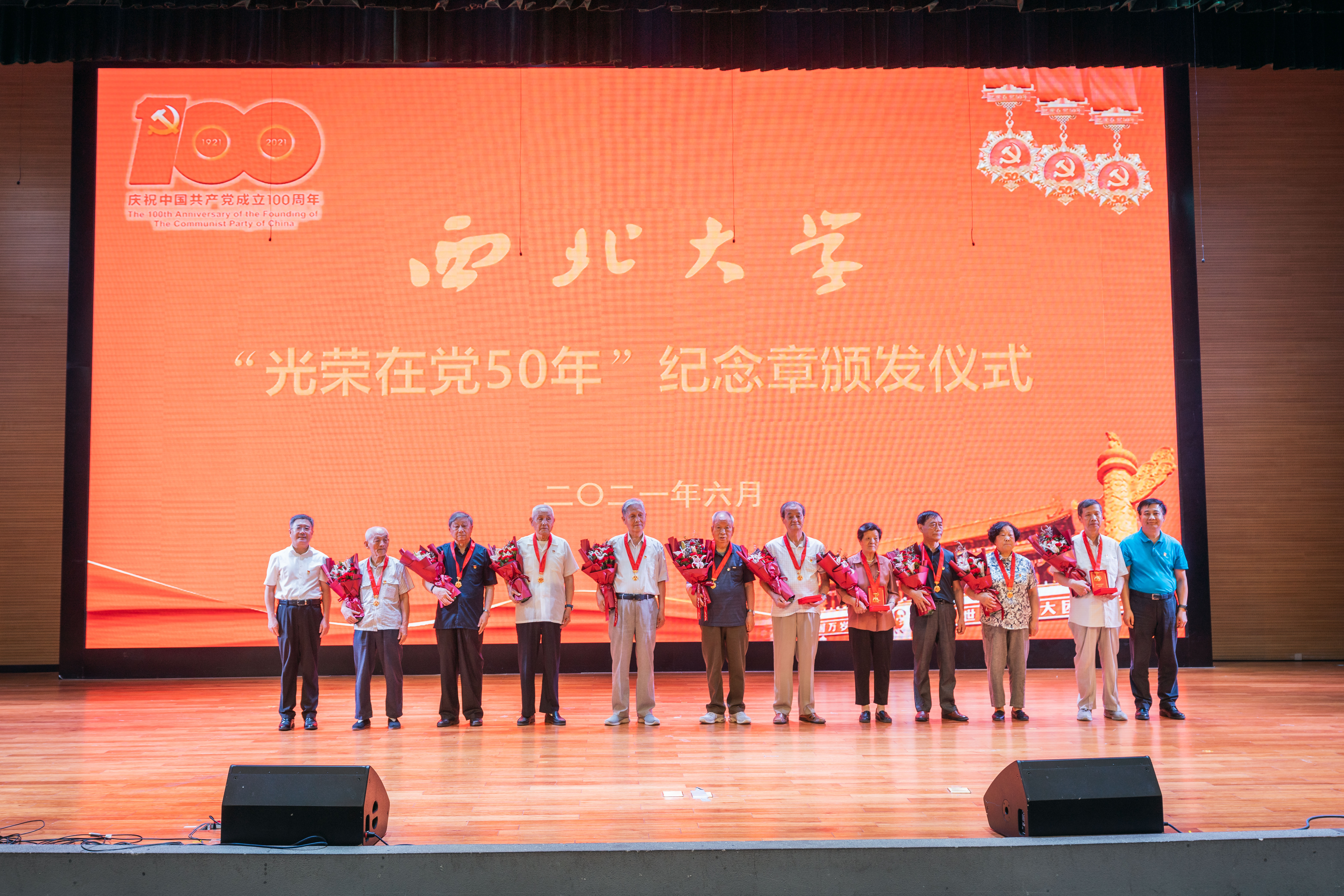奚家米代表学校党委就“光荣在党50年”纪念章颁发对象产生过程作了详细说明。在热烈的掌声中,王亚杰、郭立宏为荣获“光荣在党50年”纪念章的20名老党员代表逐一颁发纪念章并送上鲜花,向他们为党和国家建设及学校事业发展做出的贡献致以最崇高的敬意。