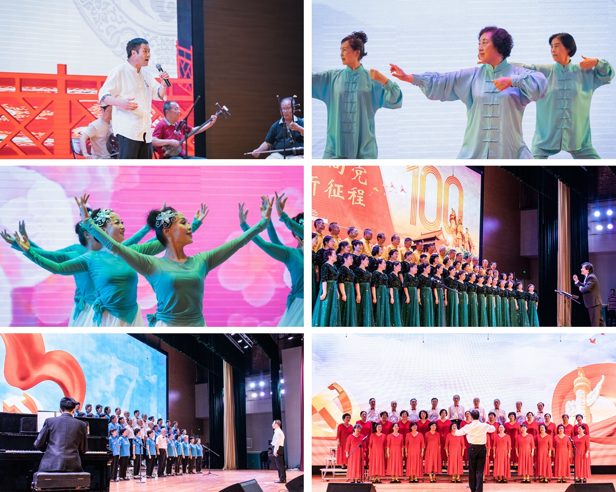 仪式结束后,与会人员共同观看了“红心永向党 启航新征程”庆祝建党100周年文艺演出。演出由beat365官网200余名离退休教职工精心筹备,通过多样化的节目向党的百年华诞献礼,抒发了老同志们对党和国家的忠诚与热爱,表达了不忘初心、再创辉煌的的坚定信念。