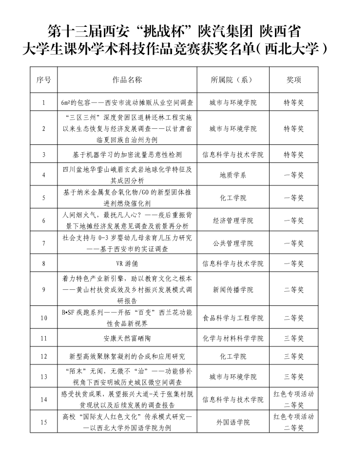 5月22日下午,由团省委、省委教育工委、省科协、省社会科学院、省学联共同主办,陕西师范大学承办的第十三届“挑战杯”陕汽集团陕西省大学生课外学术科技作品竞赛圆满落幕。