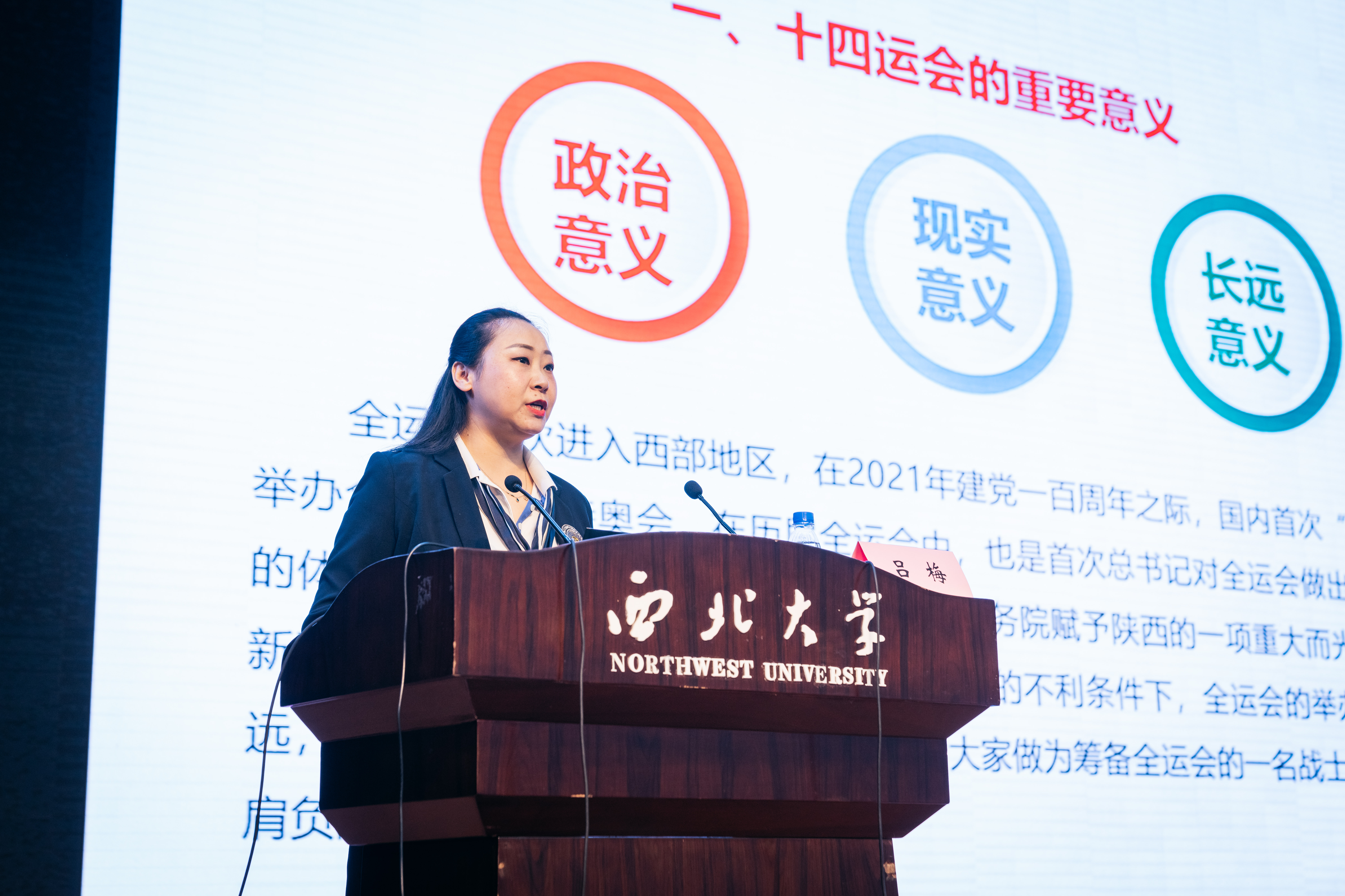5月11日,十四运会蹦床、艺术体操竞委会项目联络官吕梅应邀在beat365官网长安校区做十四运会通用知识暨竞委会工作运行计划专项培训。长安区执委会驻学校工作专班成员、学校竞委会全体工作人员和赛会志愿者共计120余人参加培训。
