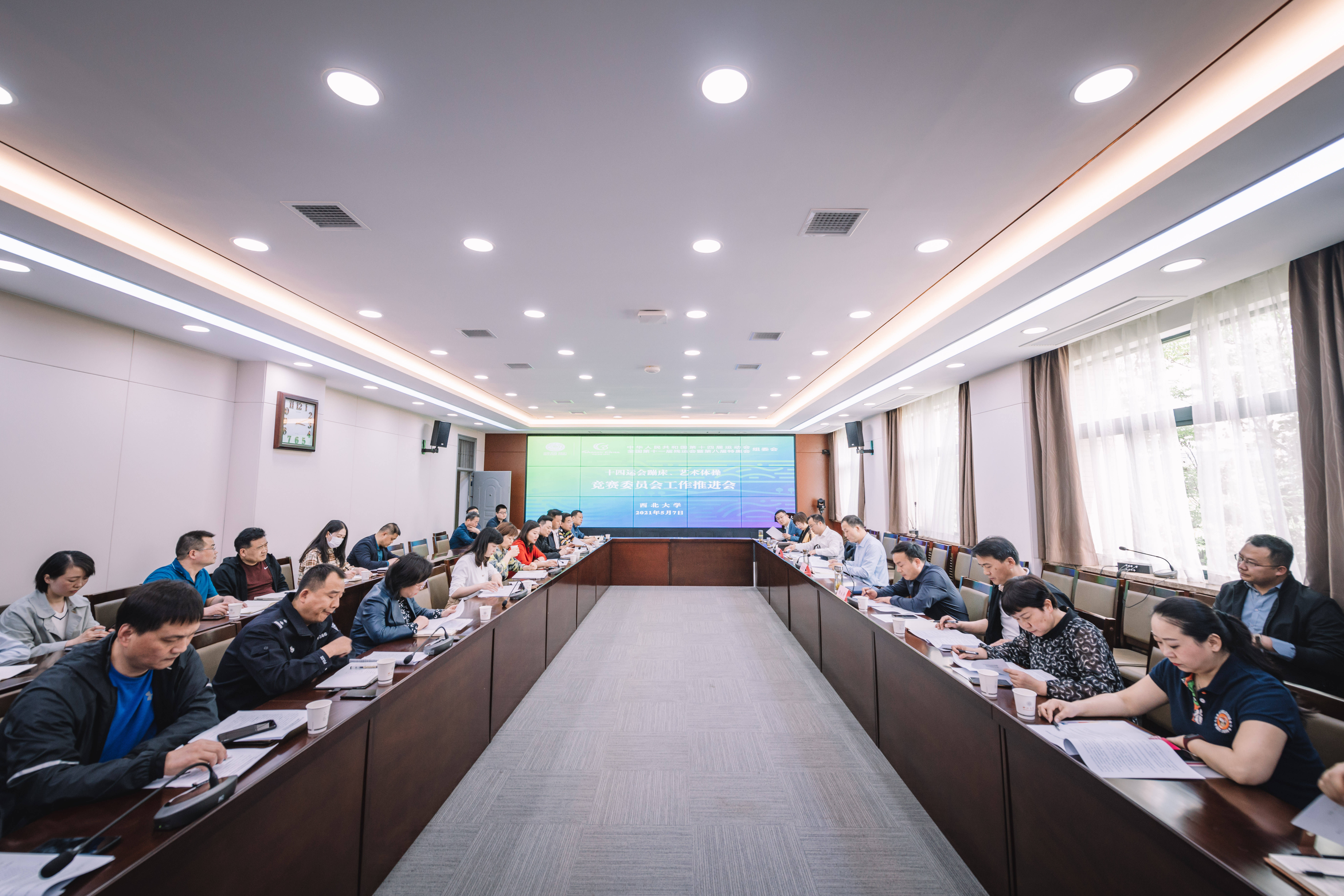 5月7日下午,学校在长安校区召开十四运会蹦床、艺术体操竞委会工作推进会。竞委会副主任、校党委副书记吕建荣,长安区执委会驻学校工作专班组长、长安区副区长杨永涛,十四运会组委会项目联络官吕梅,长安区相关职能部门负责人、驻学校工作专班成员以及学校竞委会各工作处负责人参加会议。会议由竞委会执行主任、校党委常委、副校长奚家米主持。