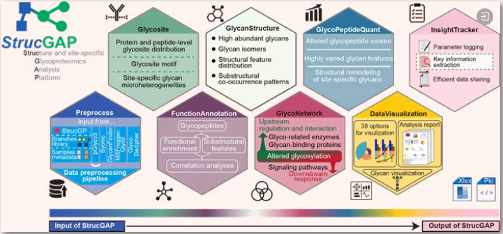 针对这一关键空白,团队在研究中逐步形成了一套系统的高精度糖蛋白质组学数据挖掘策略(Wu Y, Redox Biology, 2025; Zhang Z, Advanced Science, 2025),并借此开发了StrucGAP数据挖掘平台。该平台采用模块化设计,集成数据预处理、糖蛋白/糖基化位点表征、聚糖结构解析、糖肽定量差异分析、功能注释、糖基化调控/互作网络构建、可视化报告输出以及关键信息提取八大核心模块,贯通了糖蛋白质组生物信息学的完整分析流程。作为糖蛋白组学领域首个模块化且可溯源的分析平台,StrucGAP默认输出600余项分析结果,内置39种可视化工具,并自动生成5类共计40页数据分析报告,实现了从原始鉴定结果到生物学机制线索提炼的高效贯通。
