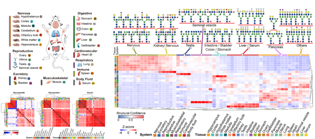 该图谱揭示了N-糖链结构呈现显著组织特异性,可精准区分组织来源,且位点特异性N-糖基化在组织身份识别中的判别能力优于蛋白质组与整体糖组。研究还发现,糖链结构微不均一性的形成并非随机,而是存在明确的“优先搭配”与协同调控规律,为理解糖基化在组织功能特化中的调控机制提供了重要理论基础。