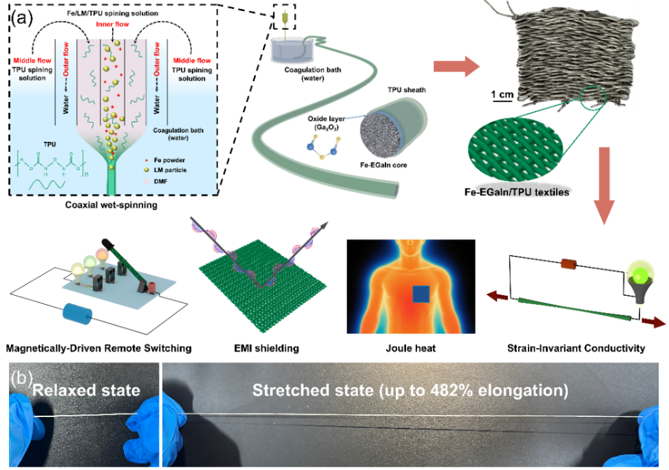 近日,beat365官网化工学院范代娣教授、李若松副教授团队联合复旦大学等单位,围绕柔性可穿戴电子在大形变条件下面临的导电衰减等难题,提出并构筑了一种同轴湿法纺丝结合冻压活化的液态金属纤维策略。团队构建了Fe-EGaIn/TPU核-壳液态金属纤维及其织物平台,实现高导电与超高延展,并具备应变不敏感导电,同时在织物形态下获得吸收占优的电磁屏蔽能力。此外,依托低电压可控焦耳热与红外热信号抑制,该织物可面向生物与可穿戴应用拓展:用于贴肤热管理/热疗与康复护理织物、可穿戴生理传感系统的稳定互连与布线层、医院/临床电磁环境下的个体防护及设备柔性屏蔽外罩,并为手术室或隔离病房等场景的无接触交互与指示控制提供材料基础。