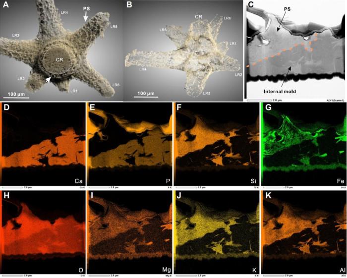 团队对这些极其微小的开腔骨骨片开展了系统研究。通过对大量大小仅为300μm化石骨片的扫描电镜、显微CT、聚焦离子束与扫描电镜联用及透射电子显微镜能谱分析,发现了这些骨片上存在大量以黏土矿物保存的多边形结构,如同“蜂巢”一般包覆整个开腔骨骨片。