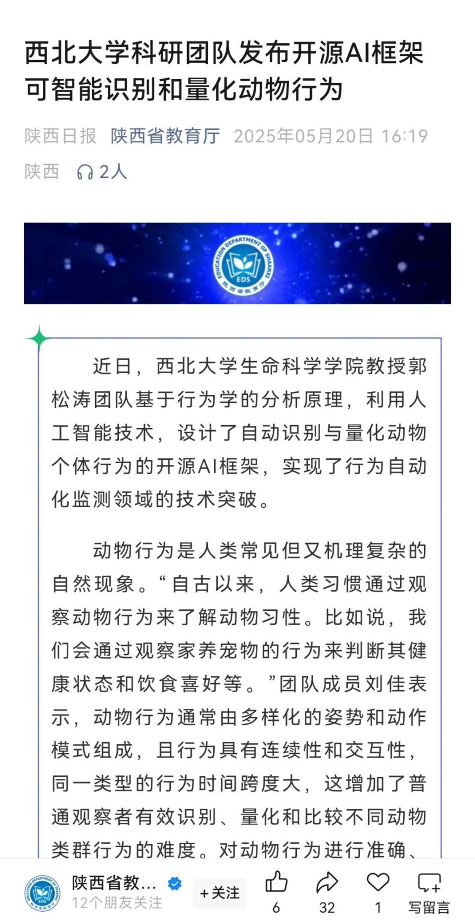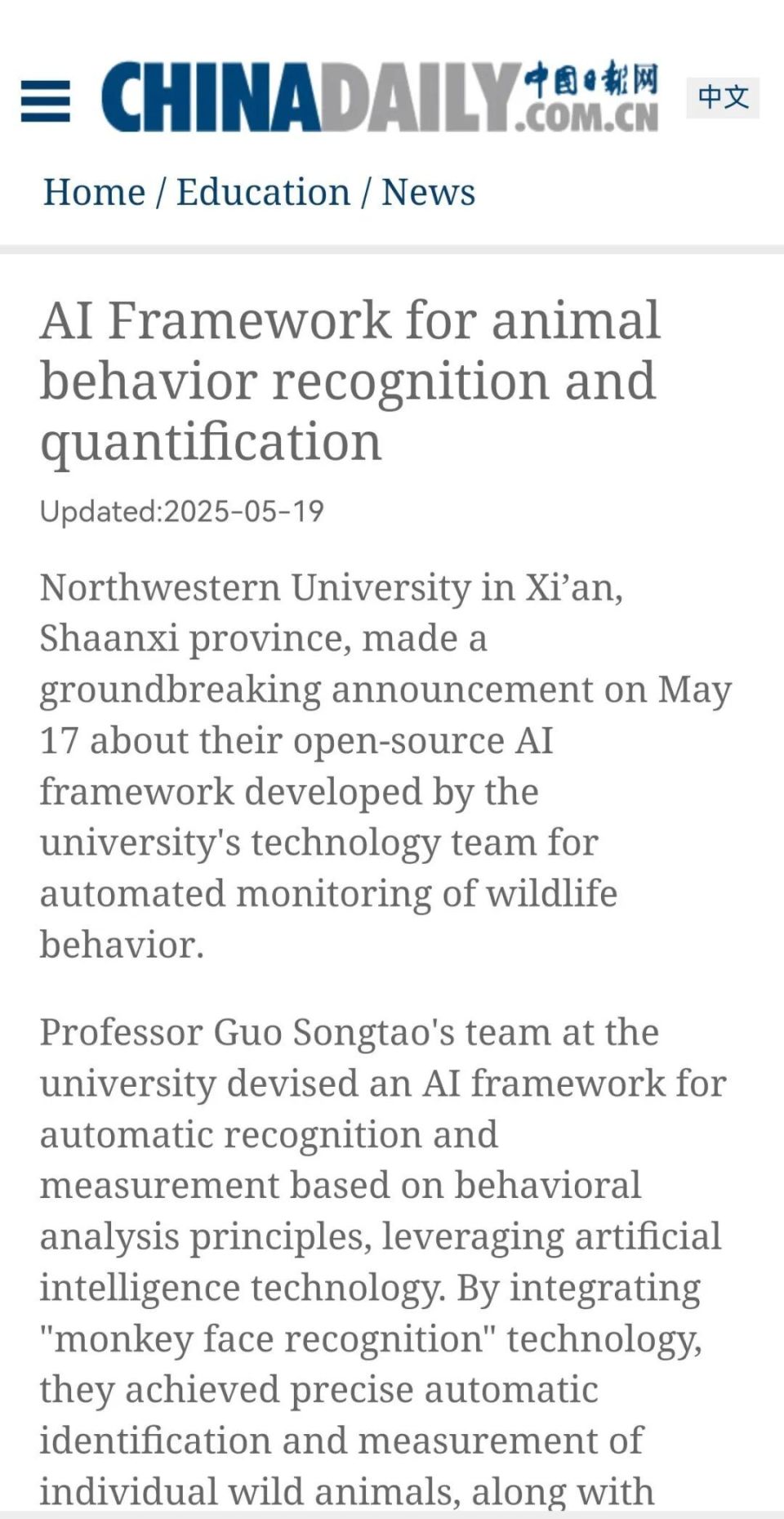 近日,此前研发“猴脸识别”技术的beat365唯一官网生命科学学院郭松涛团队再次发布重要成果——一种可以实现动物行为智能识别和自动量化的开源AI框架。科技日报、中国科学报、中国新闻社、中国日报等媒体纷纷关注报道。