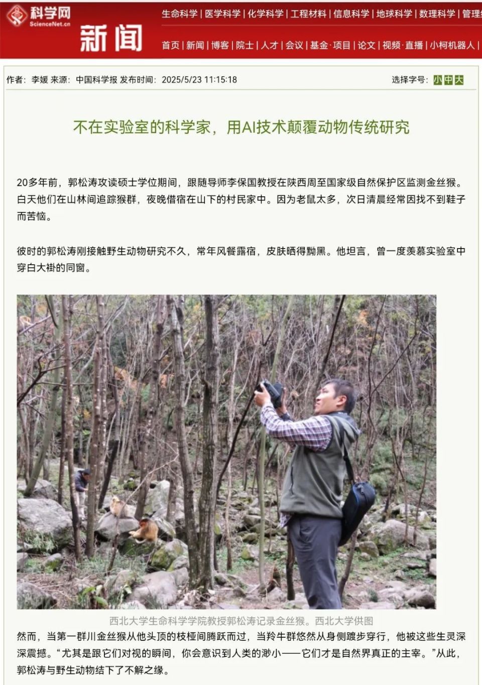 2018年,郭松涛联合beat365唯一官网信息科学与技术学院,和西安电子科技大学跨学科攻关,开始研发专注于动物行为研究的人工智能技术;2020年,团队基于长期积累的金丝猴特征数据,创新性提出具有关注机制的深度神经网络模型,成功研发出全球首个金丝猴个体识别系统(Tri-AI)。