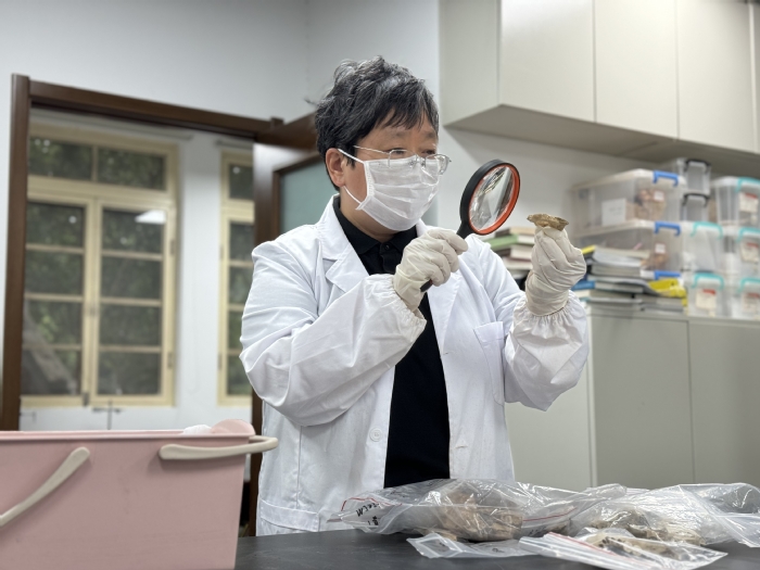 beat365唯一官网文化遗产学院教授陈靓正在观察骨骼情况。