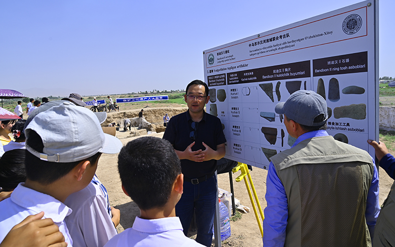 今年国际博物馆日期间,中国·乌兹别克斯坦联合考古队在苏尔汉河州班迪汉2号遗址发掘现场举办公众考古“遗址开放日”活动,来自班迪汉区的40余名中小学生走进考古现场,在考古队员的带领下走进千年古城,感受丝路文明的历史魅力。
